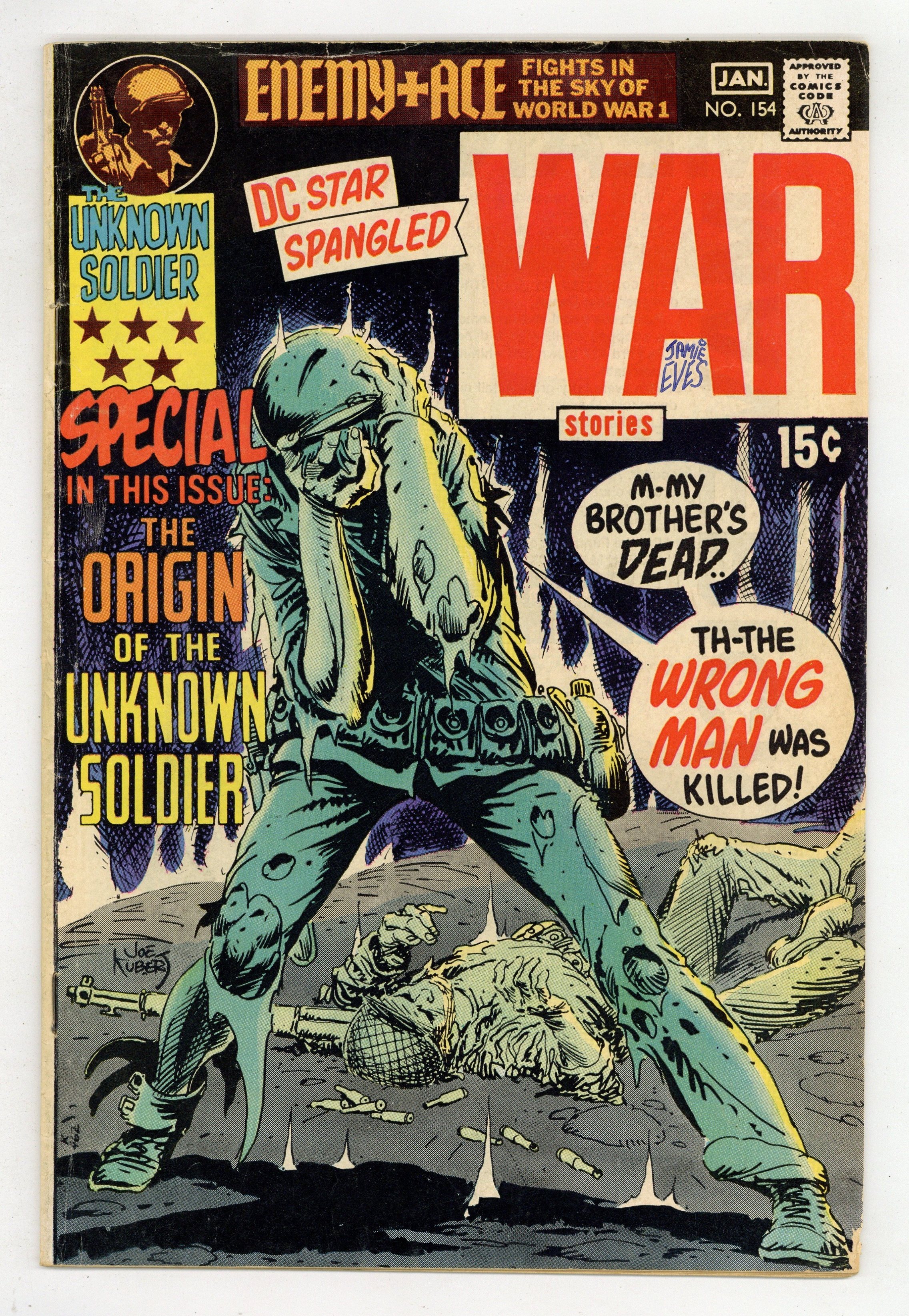 Cover art by Joe Kubert. I'll Never Die starring Unknown Soldier, script and art by Joe Kubert; origin of Unknown Soldier. Killer Of The Skies! starring Enemy Ace, script by Robert Kanigher, art by Joe Kubert; The Enemy Ace faces off agains The Hunter, a Canadian Ace, over No-Man's Land. 36 Pages, Full Color. Cover price $0.15.