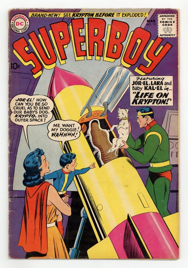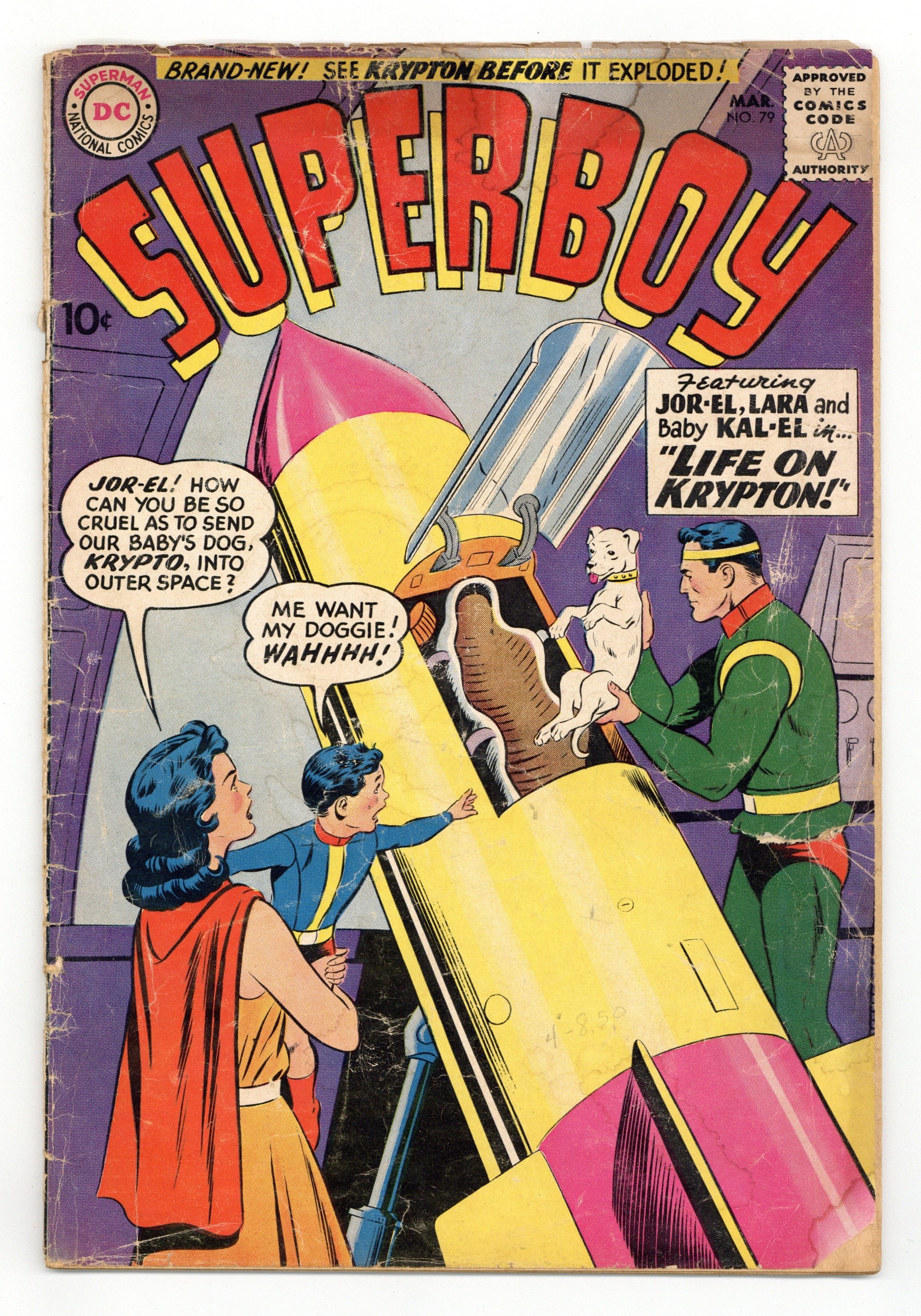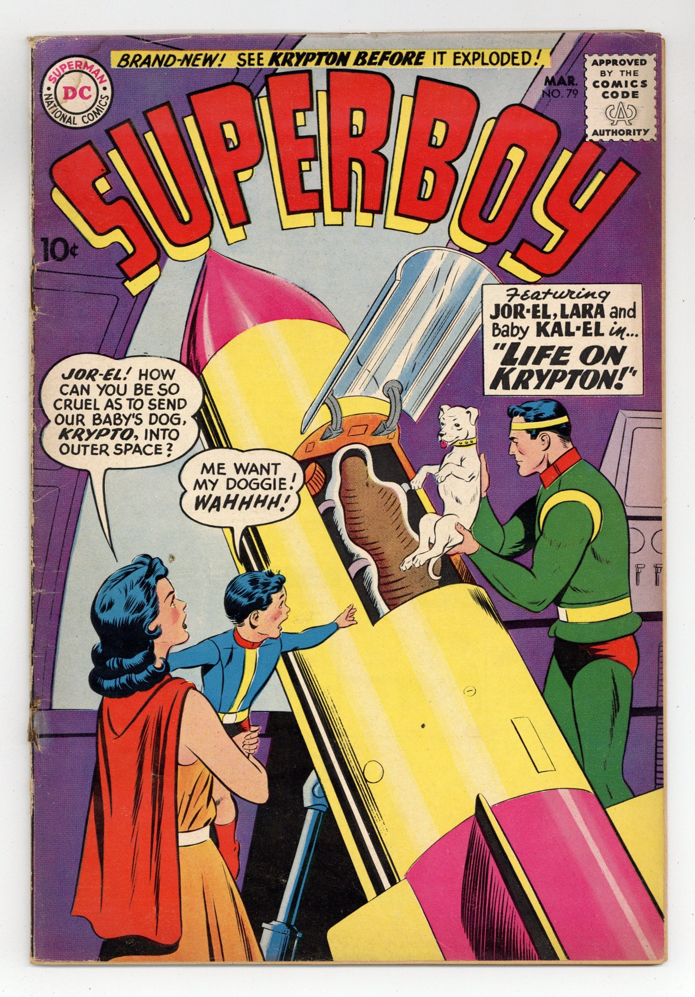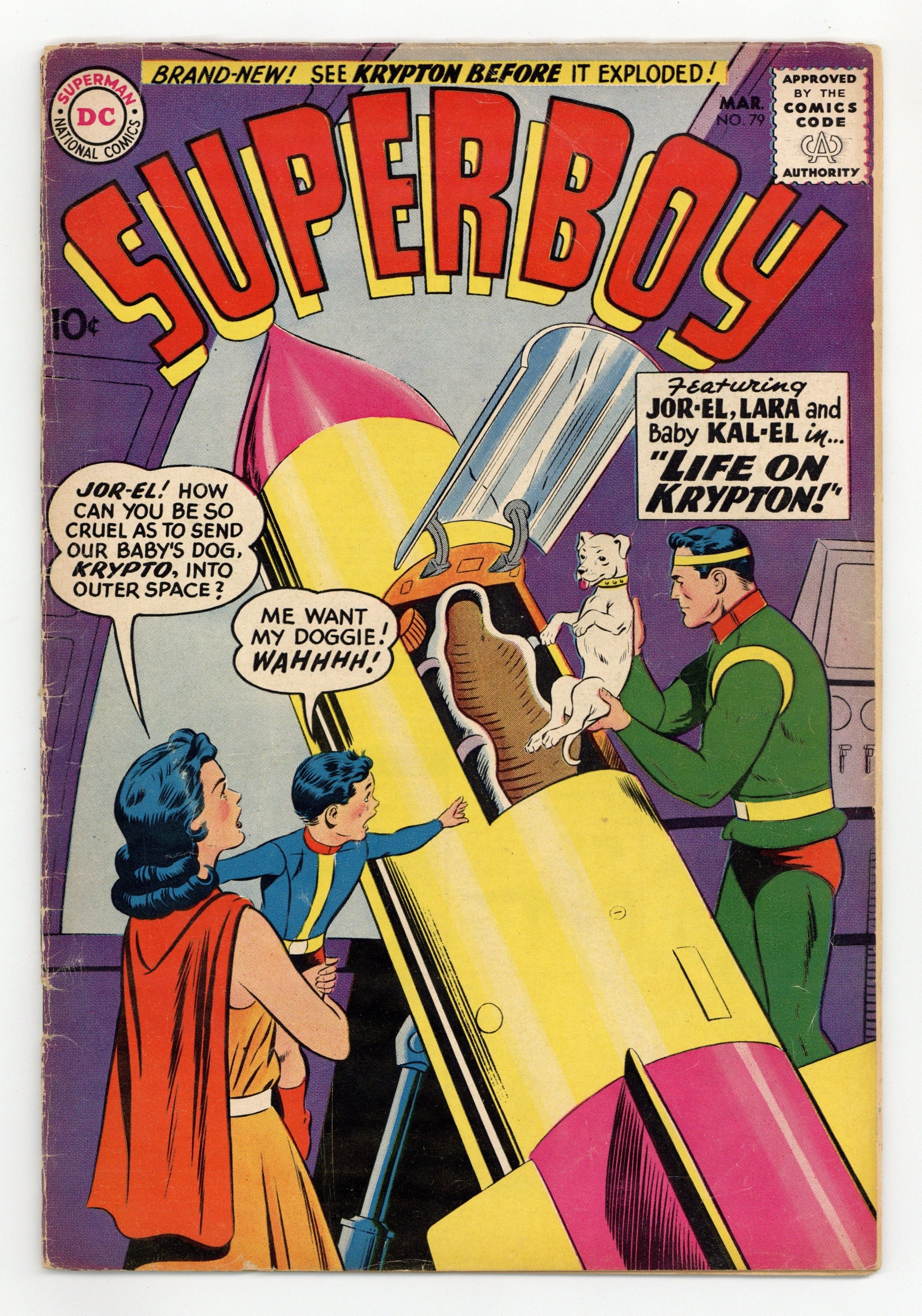 Cover pencils by Curt Swan, inks by Stan Kaye. The Spoiled Superboy!, art by Al Plastino; After Smallville refuses to make Superboy a special deputy, he goes on a rampage of poor sportsmanship. Varsity Vic humor page by Henry Boltinoff. The Notorious Captain Sinbad Kent!, script by Robert Bernstein, art by John Sikela; Superboy makes a time trip to prove the Kents aren't descended from pirates. Jerry Jitterbug humor page by Henry Boltinoff. Life on Krypton!, script by Jerry Siegel, art by George Papp; Using his Mind Prober Ray, Superboy recalls the events of a day of his life as young Kal-El on Krypton; His father Jor-El had put Krypto into a test rocket and sent him into space, but was unable to bring him back. 36 Pages, Full Color. Cover price $0.10.