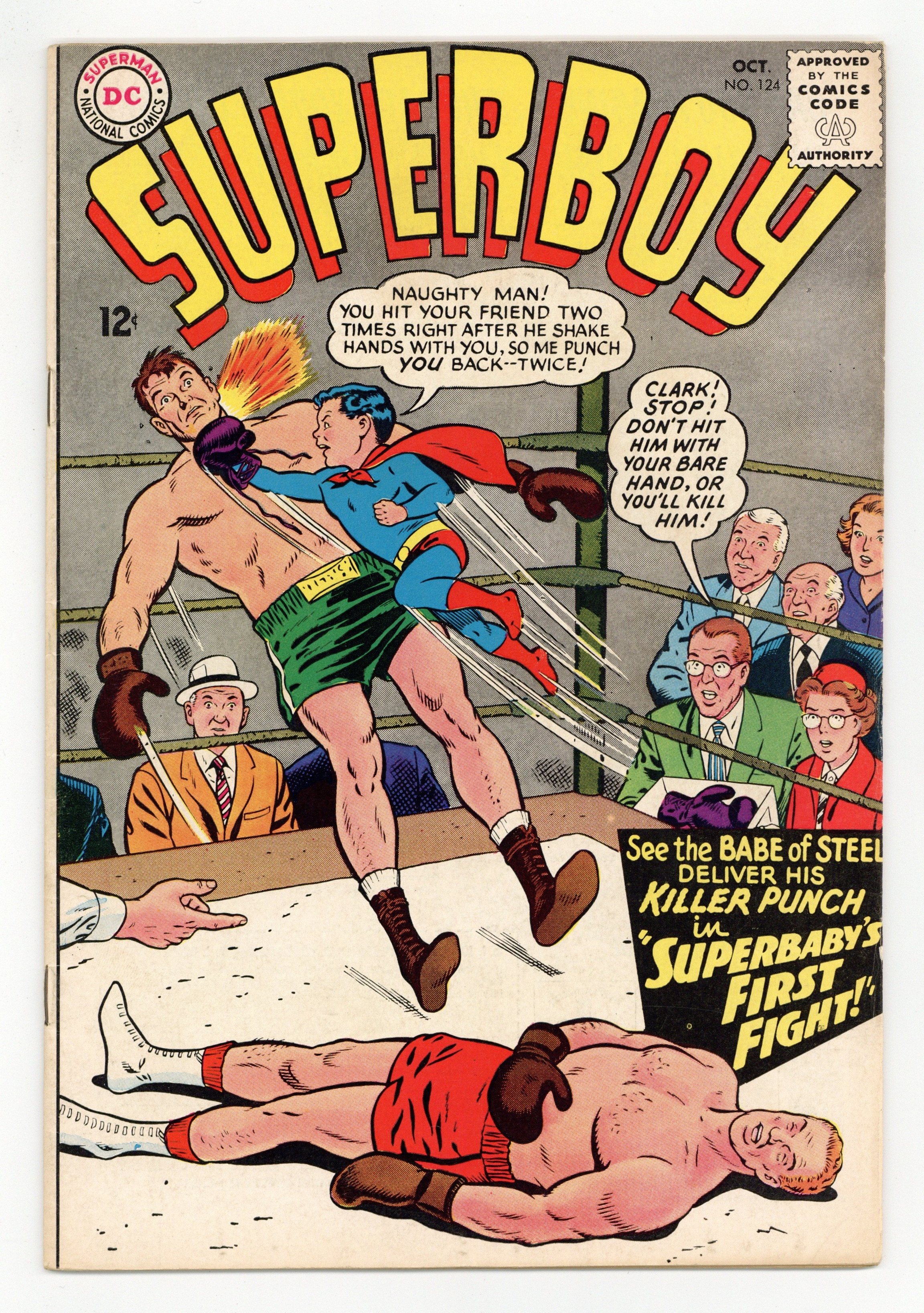 Tags: Superman$14.00Cover art by Curt Swan, inks by George Klein. The Insect Queen of Smallville!, script by Otto Binder, art by George Papp; Lana helps an alien who rewards her with a ring that gives her the powers of insects. Are You a Litter-Bug? public service page by Henry Boltinoff. Superbaby's First Fight!, script by Otto Binder, art by George Papp. The Toughtest Kid in Smallville!, script by Leo Dorfman, art by George Papp; an imaginary story. Rocky and Bullwinkle star in a one-page Cheerios ad. 36 Pages, Full Color. Cover price $0.12.