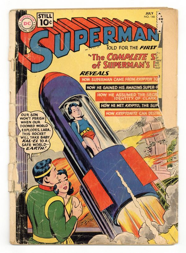 Tags: Superman$27.50- 2 1/2" cumulative spine split. Lateral spine tears. Cover detached. Water damage. Staple rust.