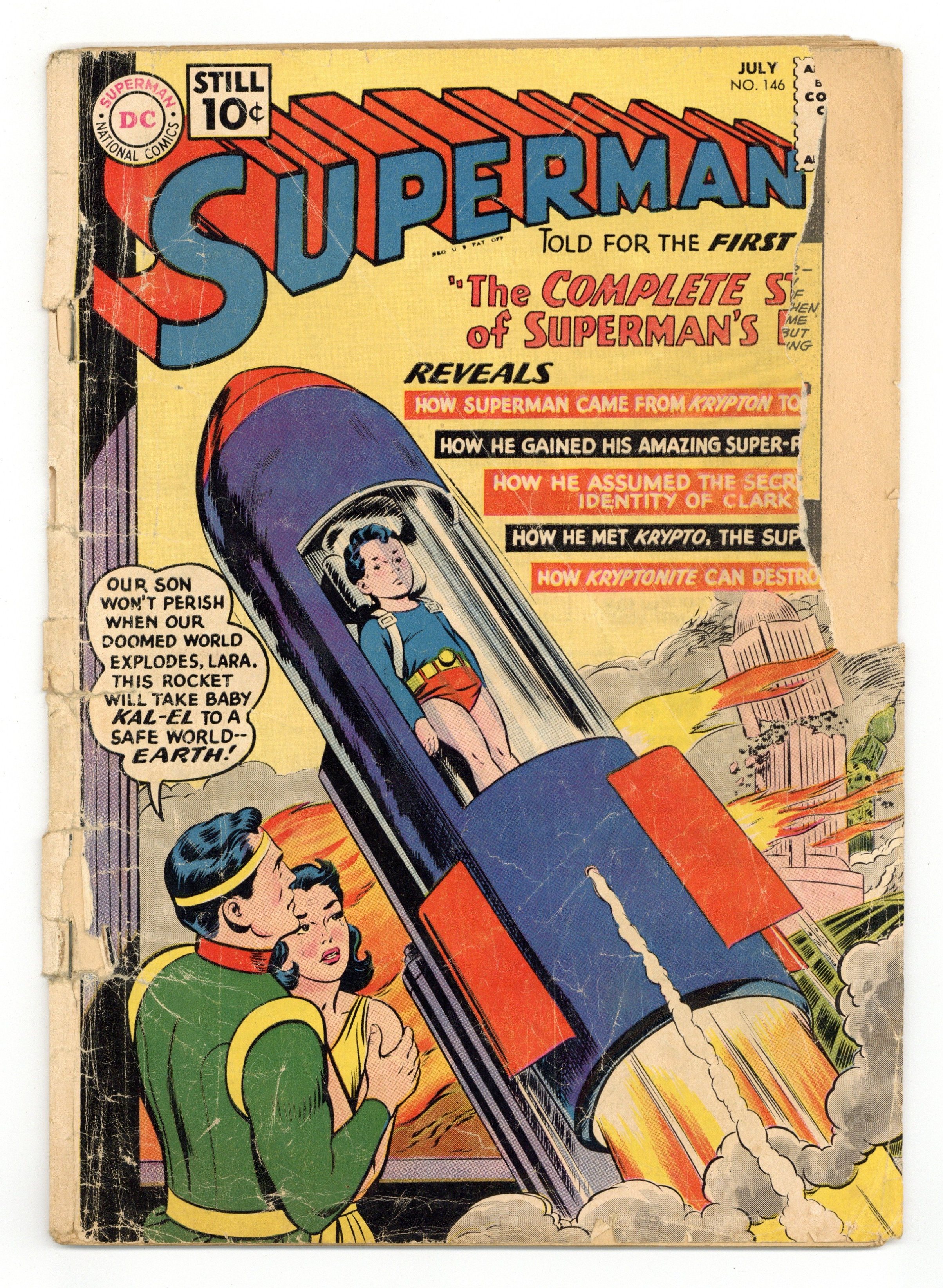Classic Cover. Cover pencils by Curt Swan, inks by Sheldon Moldoff. The Story of Superman's Life!, script by Otto Binder, art by Al Plastino; a recap of Superman's life. Superman's Greatest Feats!, script by Jerry Siegel, art by Al Plastino; Lori Lemaris asks Superman to go into the past and stop Atlantis from sinking; Superman continues to change other past events, including the assassination of Lincoln, Custer's Last Stand and the explosion of Krypton. 36 Pages, Full Color. Note: This is the 2nd time in history that Superman's powers are linked to Earth's yellow sun. Cover price $0.10.