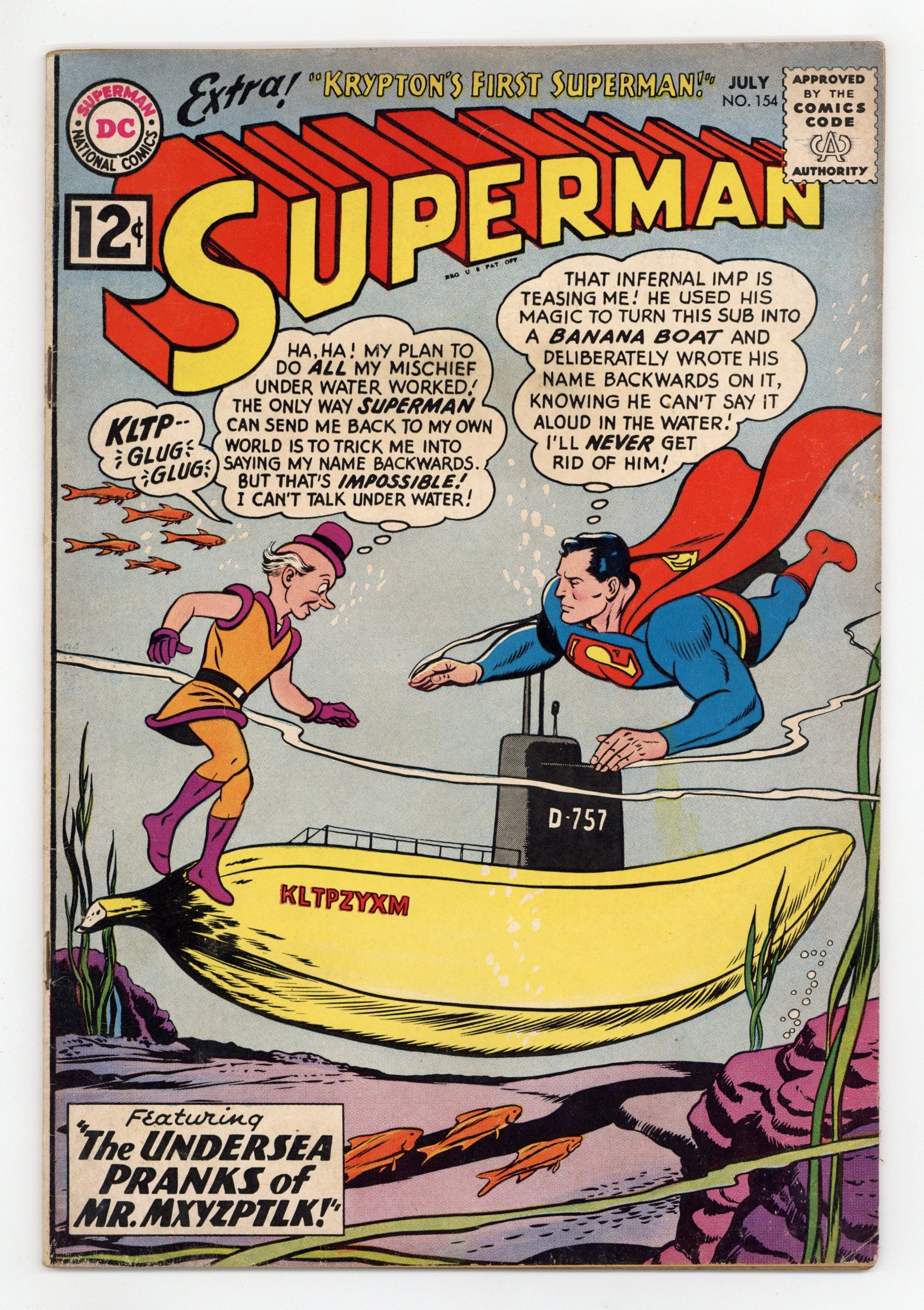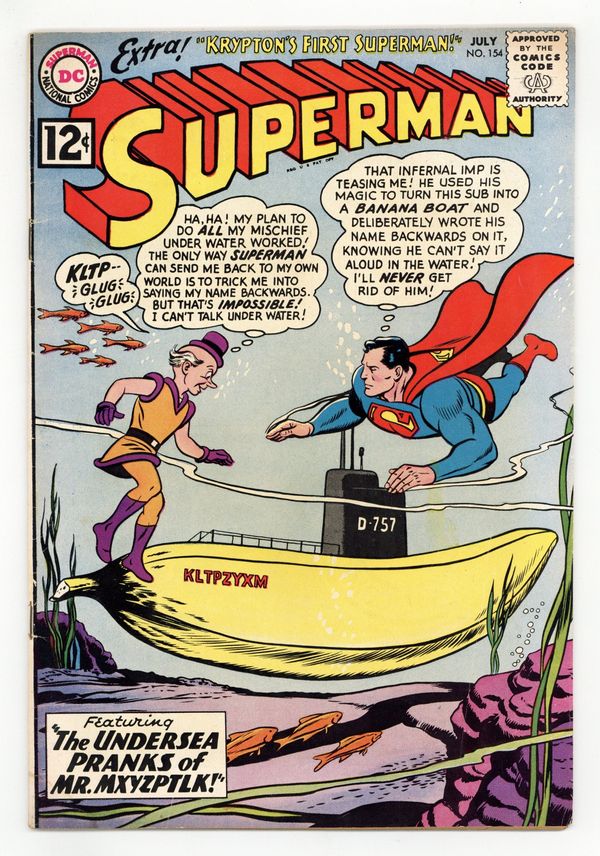 Cover pencils by Curt Swan, inks by George Klein. The Underwater Pranks of Mr. Mxyzptlk!, script by Edmond Hamilton, pencils by Curt Swan, inks by George Klein; Mr. Mxyzptlk returns to the 3rd dimension to attempt to win a practical joke contest in his home dimension. Krypton's First Superman! starring Lori Lemaris, script by Jerry Siegel, pencils by Curt Swan, inks by George Klein; Supergirl discovers why Superman has begun to act evil at random intervals, and it all goes back to before Krypton exploded. Superman is also featured in a one-page public service announcement, Be a Good Citizen. 36 Pages, Full Color. Cover price $0.12.