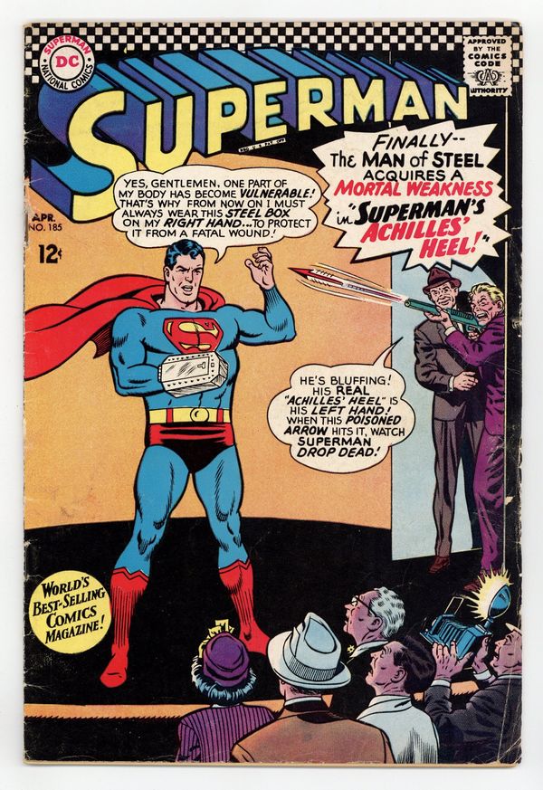 Cover pencils by Curt Swan, inks by George Klein. Superman's Achilles' Heel!, art by Pete Costanza; The Man of Steel resorts to wearing a steel box on his right hand after Red Kryptonite gives him a vulnerable "Achilles' Heel". Target Superman! [part 1], art by Jim Mooney; Rich Dolores Rivera uses her fortune to try to snare Superman. The Irresistible Clark Kent! [part 2]; Vol-Don of the Look-Alike Squad of Kandor impersonates Clark Kent to help Superman. 36 Pages, Full Color. Cover price $0.12.