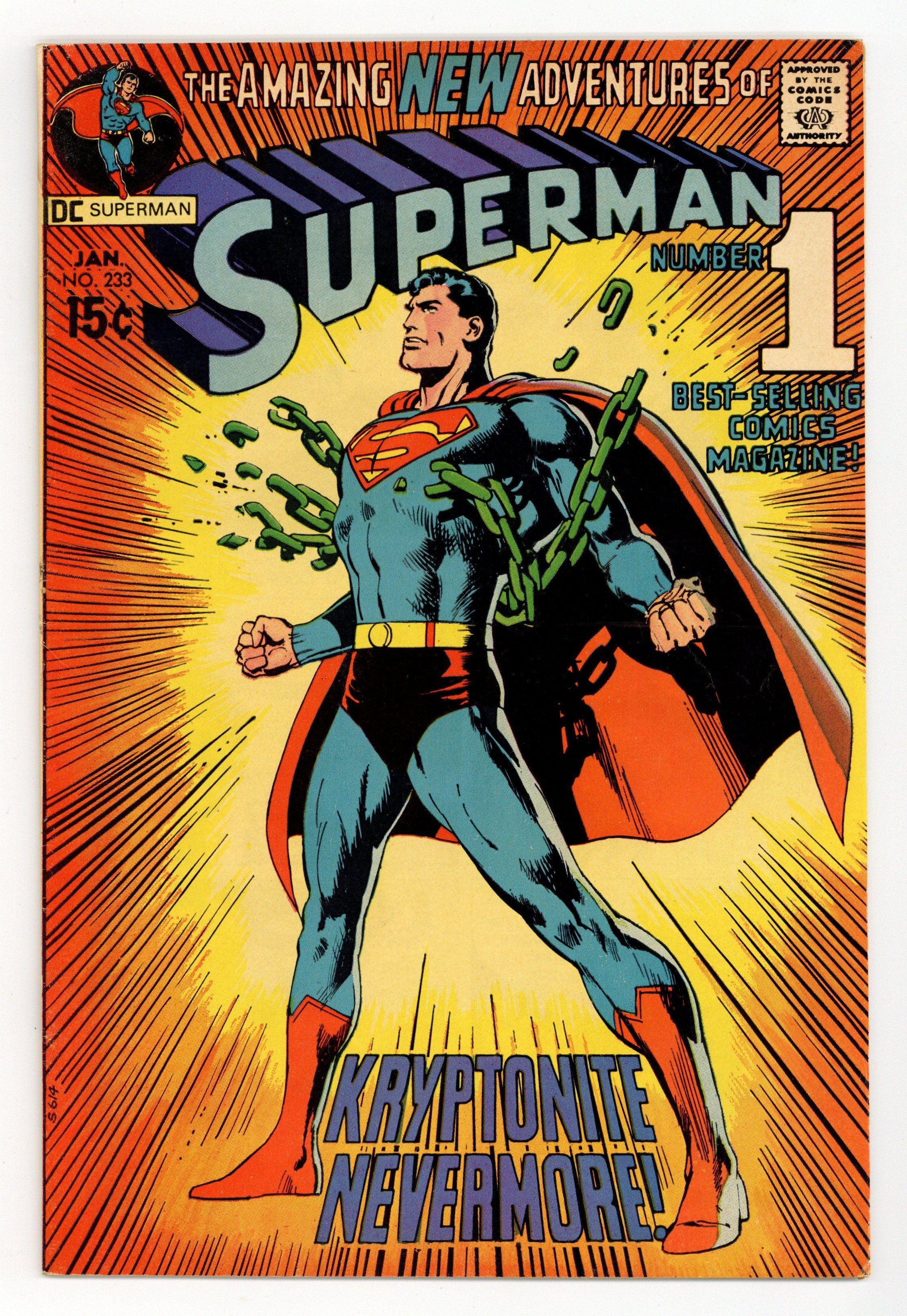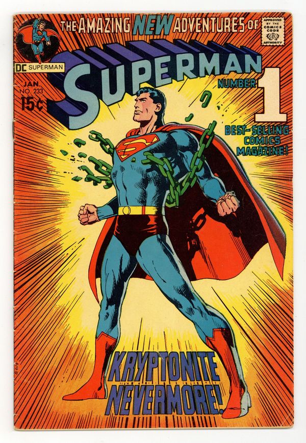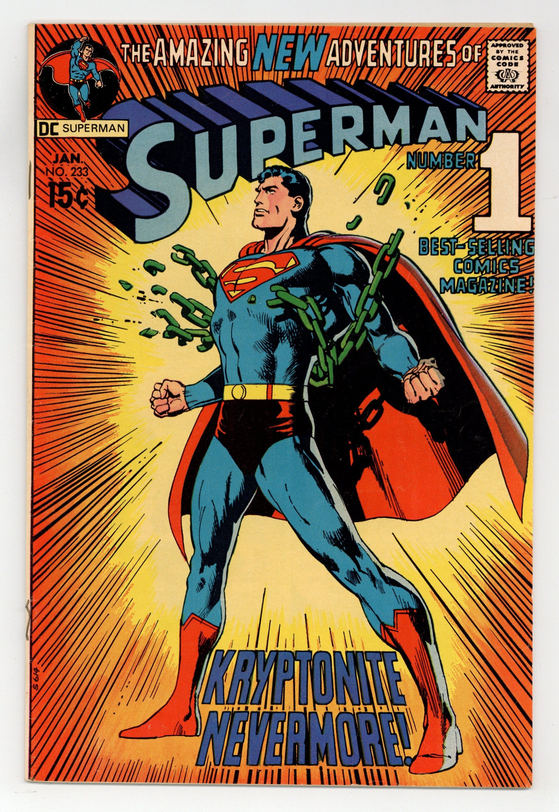 Starts Mar 2 Cover art by Neal Adams. Superman Breaks Loose, script by Denny O'Neil, pencils by Curt Swan, inks by Murphy Anderson; A scientific experiment turns all the kryptonite on Earth to iron, as Clark Kent moves from newspaper to television journalism. Super-Turtle humor page by Henry Boltinoff. Jor-El's Golden Folly--The Fabulous World of Krypton, script by E. Nelson Bridwell, art by Murphy Anderson; Ignoring the jeers of his colleagues, Kryptonian scientist Jor-El experiments with using anti-gravity to aid in space travel. 36 Pages, Full Color. Cover price $0.15.