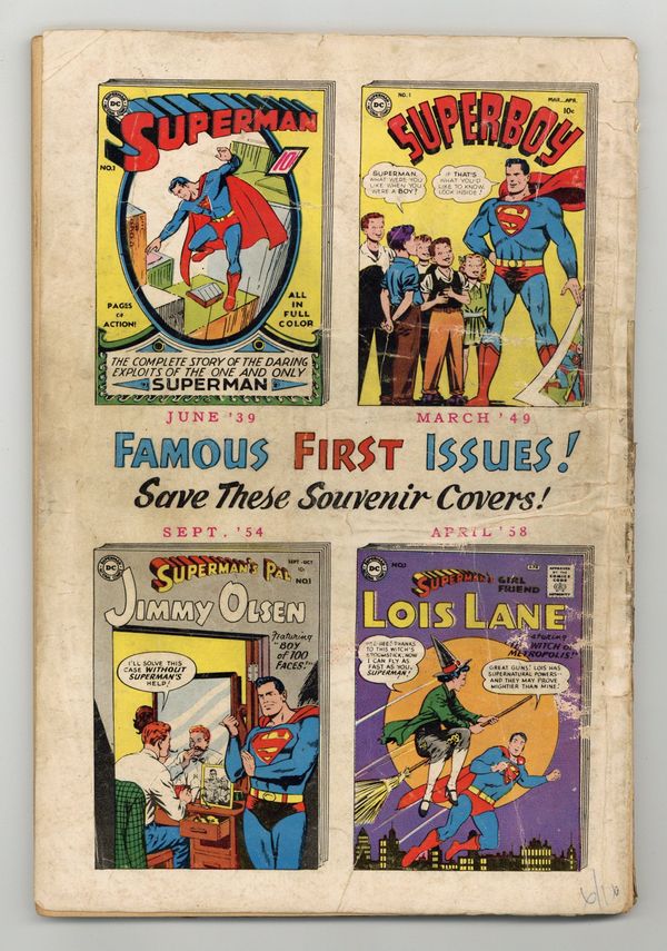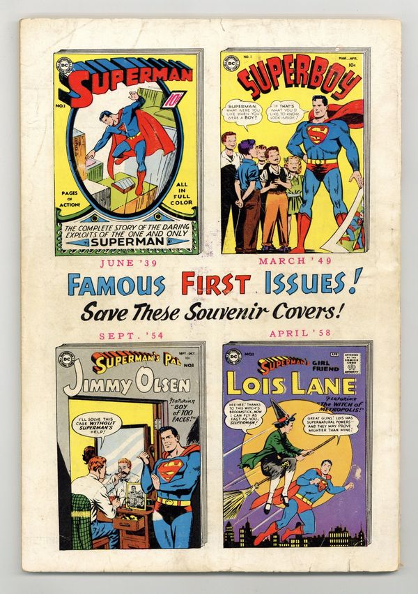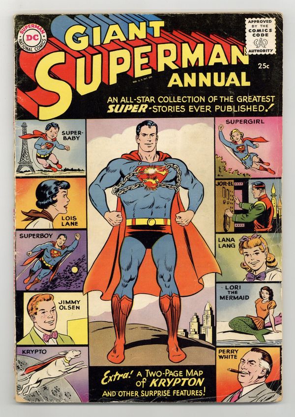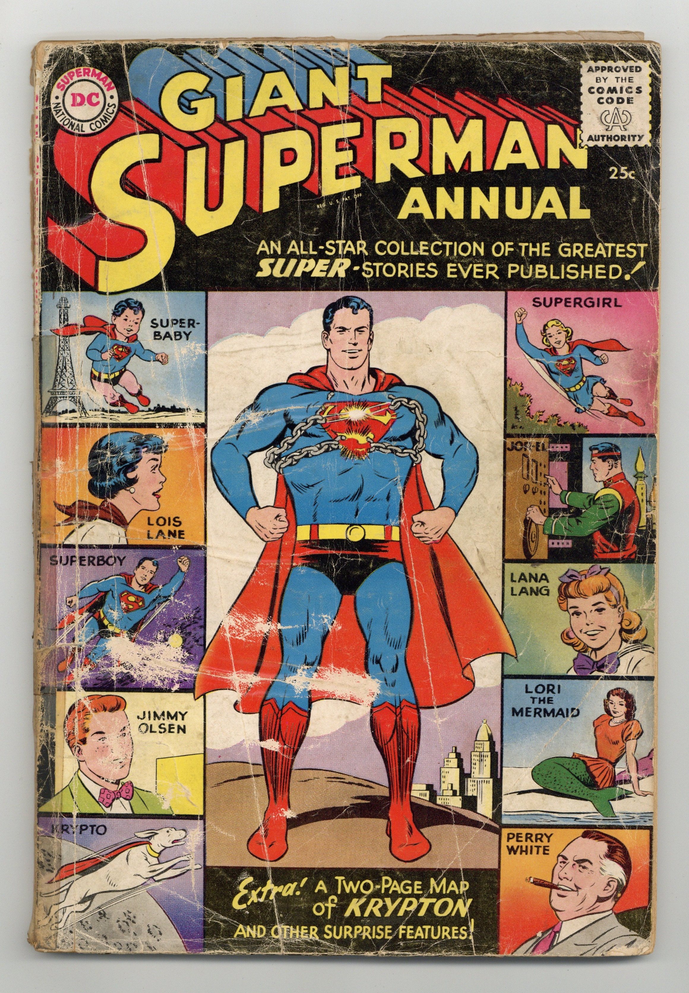 84 pages. 1st Silver Age DC annual. Reprints 1st Supergirl story, "The Supergirl from Krypton" (Action # 252), "Superman's First Exploit," "The Witch of Metropolis," "A Visit from Superman's Pal," "The Girl in Superman's Past," "The Execution of Krypto," "The Fattest Girl in Metropolis," "The Super-Brain of Jimmy Olsen," and "The Super-Key to Fort Superman" (Batman appearance). This issue also includes a two-page map of Krypton. Curt Swan cover pencils. Cover price $0.25.