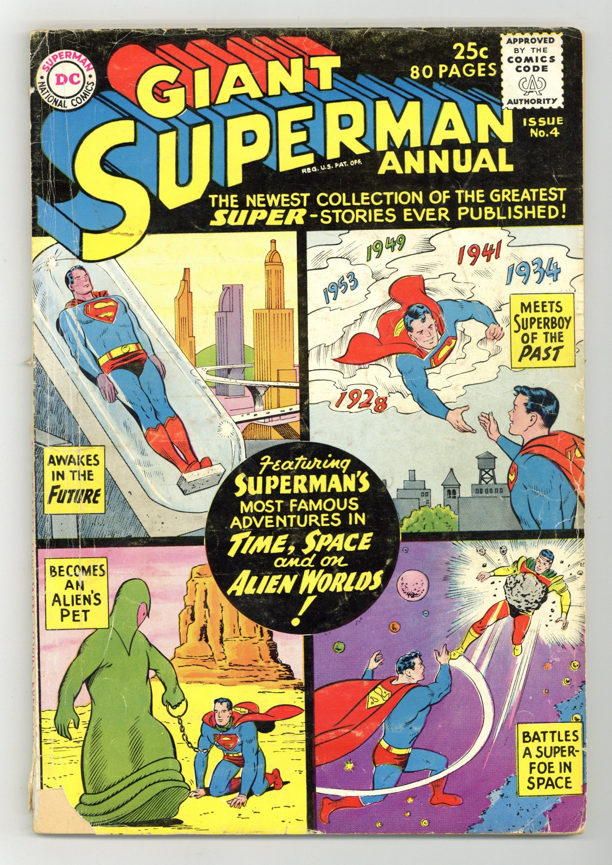 11th appearance of the Legion of Super-Heroes; 1st Legion origins (text and Curt Swan illustrations). Stories include "A Doghouse for Superman," "Superboy Meets Superman," "The Alien Who Conquered Superman," "The Bride of Futureman," "The Outlaws From Krypton," Jimmy Olsen in "The Boy Who Killed Superman" (pencils by Curt Swan), "Rip Van Superman," and "The Menace of Planet Z!" Swan cover pencils. 80 pgs. Cover price $0.25.