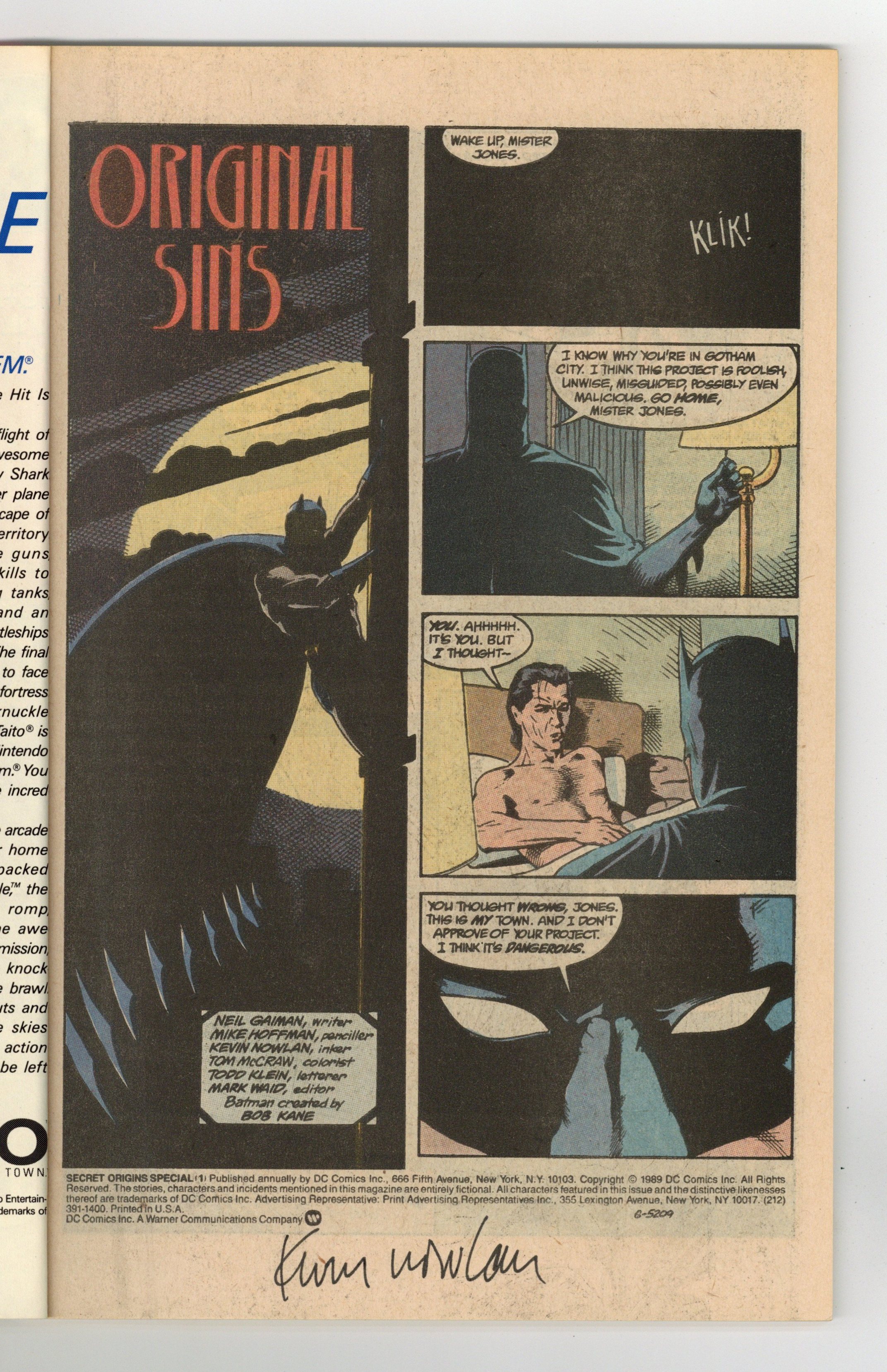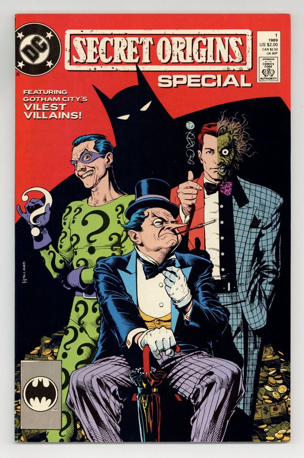 A look at the secret origins of Penguin, the Riddler and Two-Face. Framing sequence is the making of a 'Steve Jones Investigates' special, taking a look at the costumed criminals of Gotham, in "Original Sins." Script by Neil Gaiman, art by Mike Hoffman & Kevin Nowlan. Origins: Penguin in "The Killing Peck." Script by Alan Grant, art by Sam Kieth; the Riddler in "When is a Door." Script by Neil Gaiman, art by Bernie Mireault & Matt Wagner; Two-Face in an untitled tale. Script by Mark Verheiden, art by Pat Broderick & Dick Giordano. Cover by Brian Bolland. Cover price $2.00.