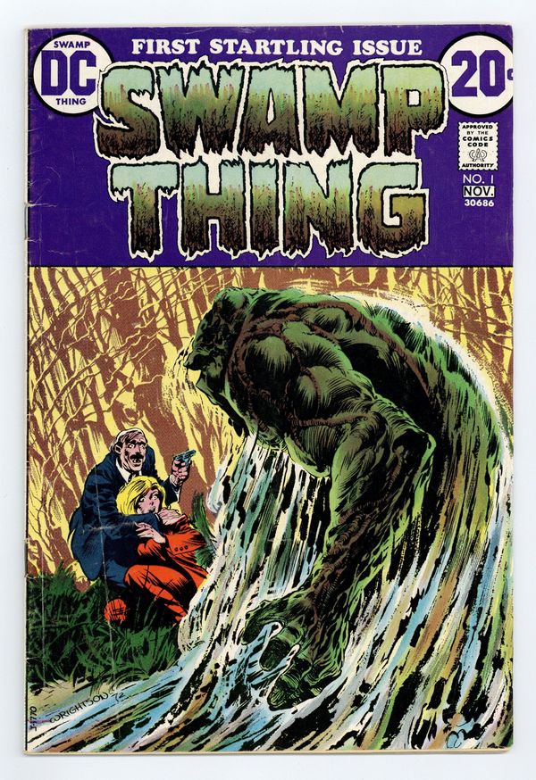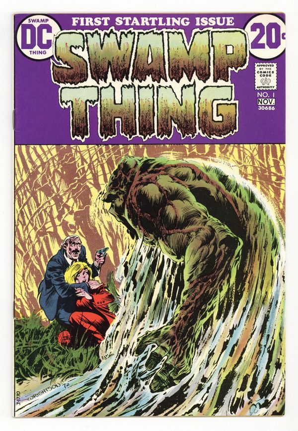 "Dark Genesis." While working on a restorative formula (that can make forests out of deserts) in the Louisiana swamps, scientist Alec Holland is killed by a bomb set off by Mr. E., who wants the formula. Shortly thereafter, a humanoid plant being rises from the swamp, created from the body of Holland, the chemicals in the formula, and the strange forces in the swamp. 1st appearance of Alec and Linda Holland. 1st appearance of Matt Cable. (Swamp Thing himself first appeared in House of Secrets 92). Script by Len Wein, art and cover by Berni Wrightson. Includes brief bios of Wein and Wrightson. Cover price $0.20.