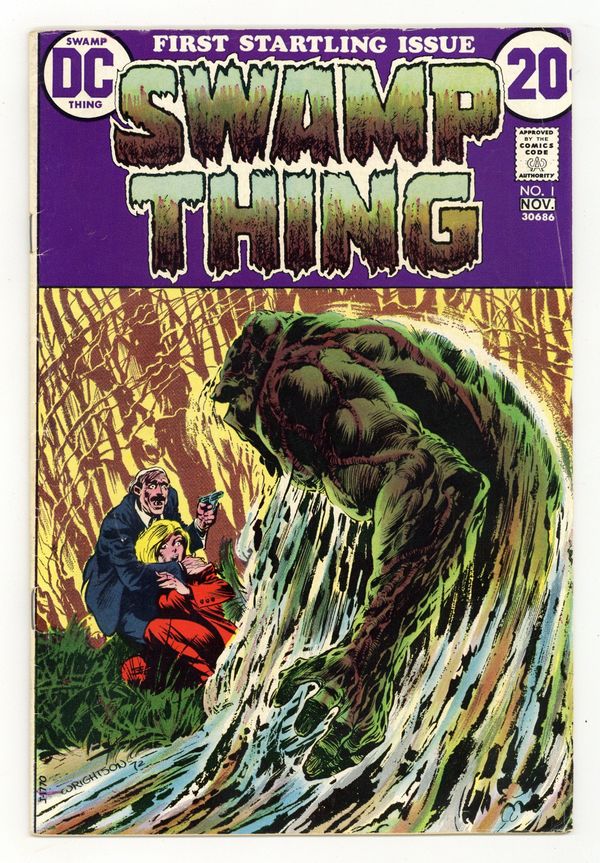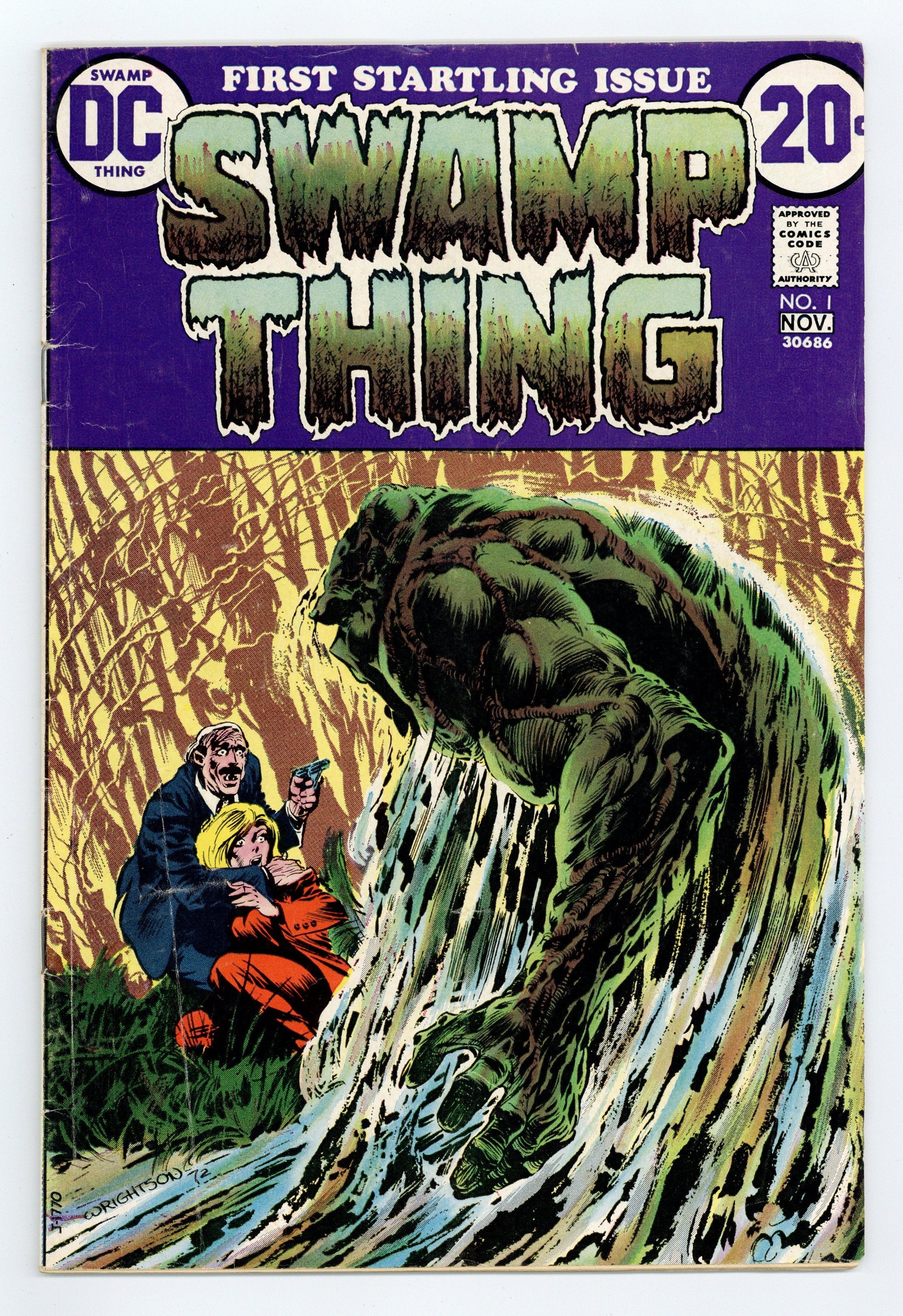 Ends Apr 15 8:14 PM CST Bid History 17 bids Current Bid $265 Your Secret Max Bid If you'd like to bid, please log in or register. "Dark Genesis." While working on a restorative formula (that can make forests out of deserts) in the Louisiana swamps, scientist Alec Holland is killed by a bomb set off by Mr. E., who wants the formula. Shortly thereafter, a humanoid plant being rises from the swamp, created from the body of Holland, the chemicals in the formula, and the strange forces in the swamp. 1st appearance of Alec and Linda Holland. 1st appearance of Matt Cable. (Swamp Thing himself first appeared in House of Secrets 92). Script by Len Wein, art and cover by Berni Wrightson. Includes brief bios of Wein and Wrightson. Cover price $0.20.
