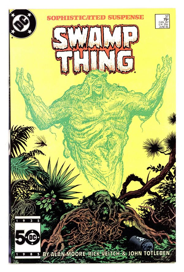"Growth Patterns!" Written by Alan Moore, with art by Rick Veitch and John Totleben. Cover by Stephen Bissette and Totleben. New "Growth Patterns" and other strange abilities emerge in Swamp Thing as he fights for survival. NOTE: 1st appearance of John Constantine, Hellblazer. 36 pages, full color. Cover price $0.75.