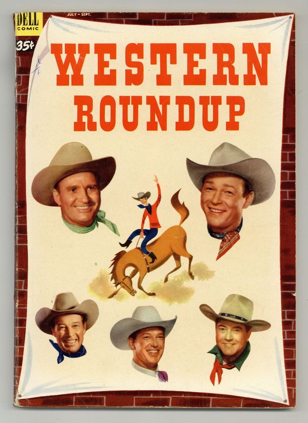 35ยข Canadian price variant. Photo cover with Gene Autry, Roy Rogers, Johnny Mack Brown, Bill Elliott, and Rex Allen. Plan for Murder starring Roy Rogers, art by John Ushler; Roy investigates an automobile accident. The No-Good Brother starring Trigger and Bullet, art by Sparky Moore. The 13th Knot starring Gene Autry, art by Tony Sgroi. A short lesson in how to read Indian pictographs. The Last Trick starring Champion, art by Nicholas Firfires. Surprise Witness text story, art by John Ushler. Brief history of Richard Wetherill's ranch. The Bullet Tip-Off starring Wild Bill Elliott, art by Hi Mankin. The Cold-blooded Frame-Up starring Johnny Mack Brown, pencils by Tony Sgroi. The Ghost starring Rex Allen, art by Mike Arens. Picture of Roy Rogers and Trigger. 100 Pages, Full Color. Cover price $0.35.