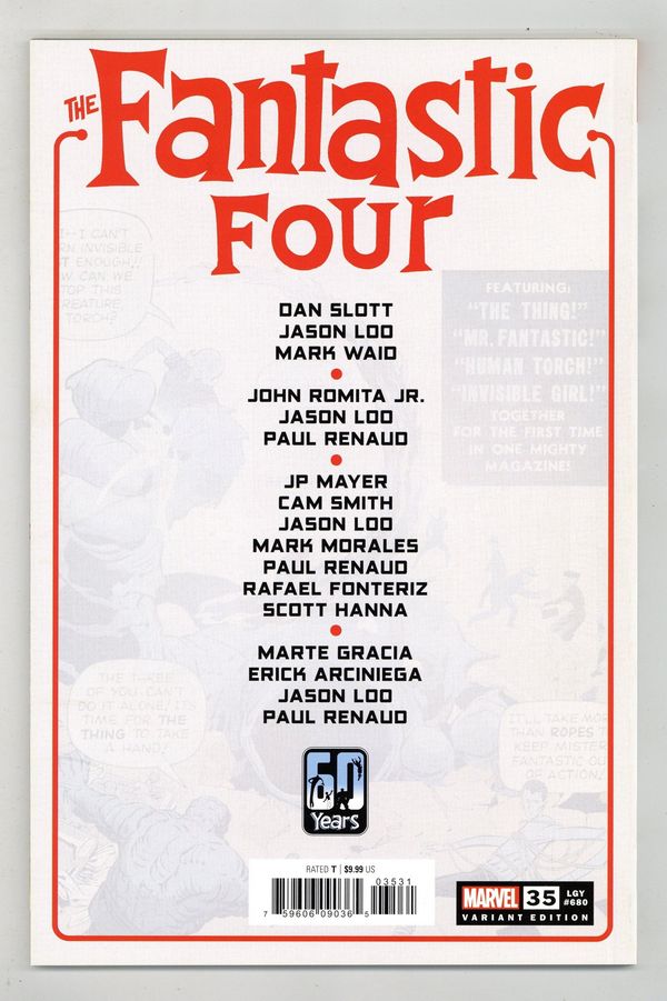 Tags: Fantastic Four$30.00Limited 1 for 100 Retailer Incentive Variant Cover. Cover by Jack Kirby. Written by Dan Slott, Mark Waid and Jason Loo. Art by John Romita, Jr., Paul Renaud, Jason Loo, JP Mayer, Scott Hanna, Cam Smith, Rafael Fonteriz and Mark Morales. A TITANIC 60TH ANNIVERSARY ISSUE! In "Death in Four Dimensions" by Dan Slott, John Romita, Jr., JP Mayer, Scott Hanna, Cam Smith, Rafael Fonteriz and Mark Morales, the entire Kang bloodline is out to destroy every era of the Fantastic Four! How can Reed, Sue, Ben and Johnny hope to survive simultaneous attacks across their lifetimes by Rama-Tut, the Scarlet Centurion, Kang the Conqueror and Kang's final descendant, the sinister Scion?! Join the FF and some special surprise guest stars as John Romita, Jr. returns to Marvel and joins forces with writer Dan Slott for this celebratory adventure! Marvel's First Family will literally never be the same again! Plus: Mark Waid and Paul Renaud deliver dramatic new insights into the origin of the fabulous foursome in the all-new anniversary tale "Stars"! And: Mole Man interrupts "Some Family Time" by Jason Loo. 96 pages, full color. Rated T Cover price $9.99.