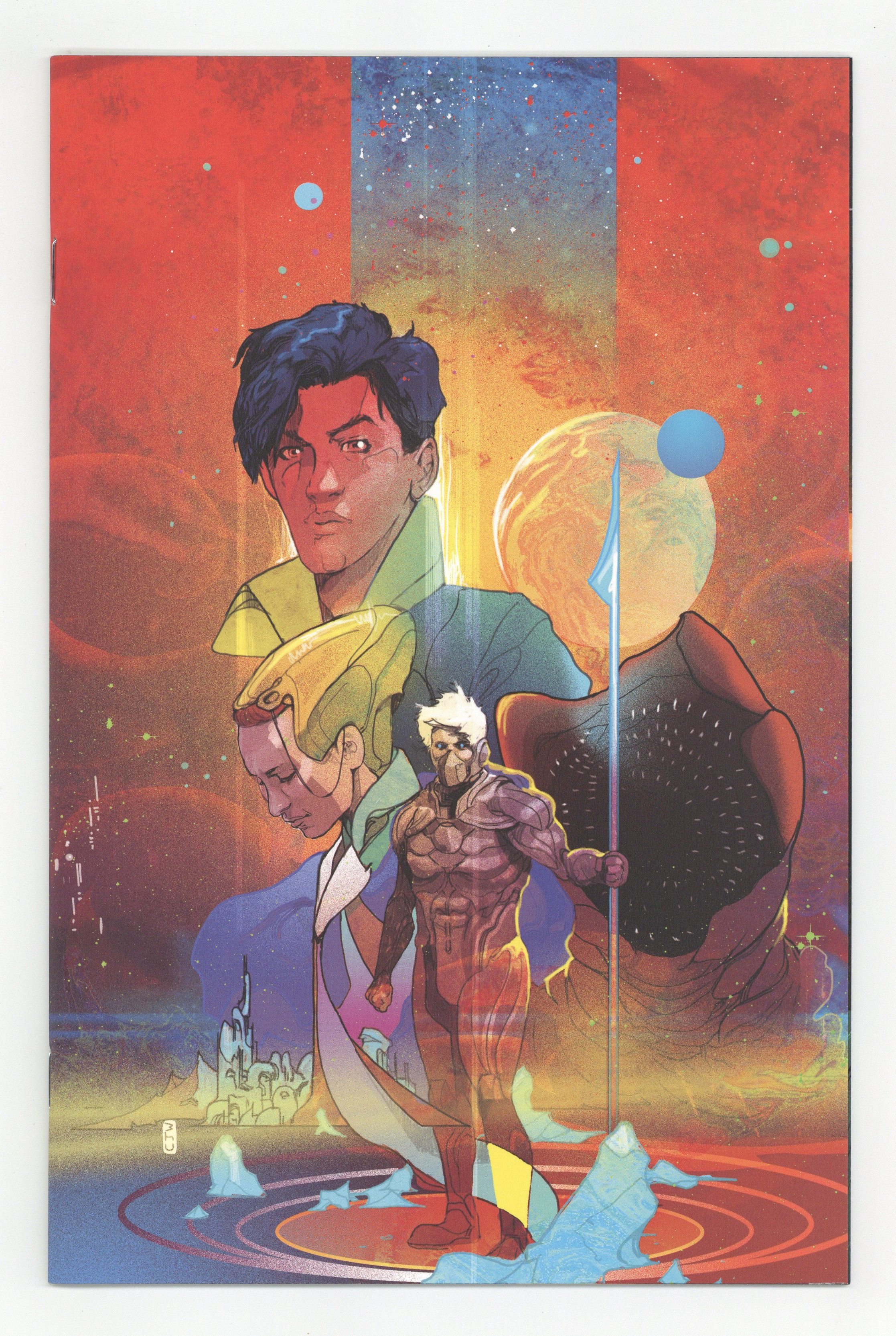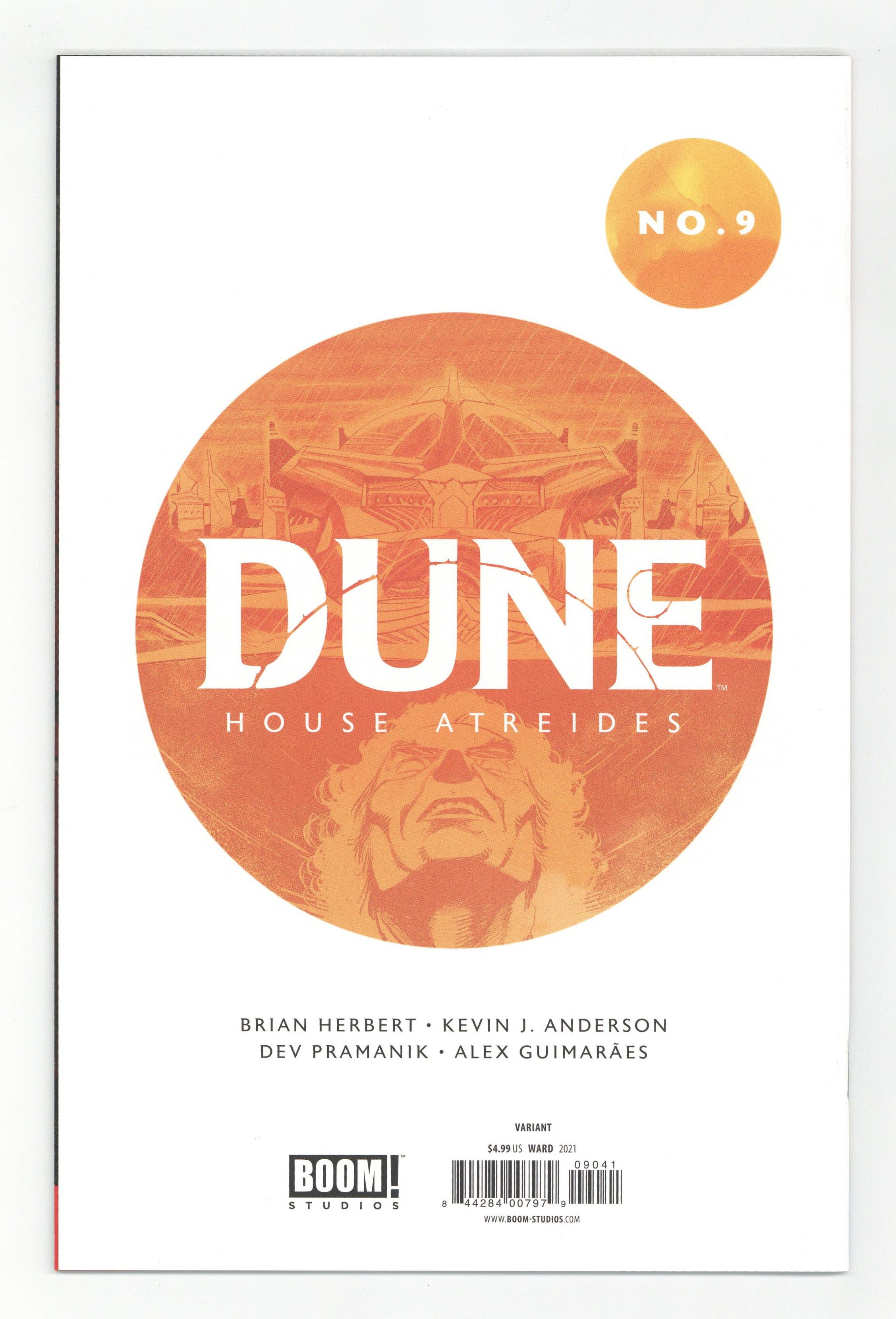 Published Aug 2021 by Boom Studios.$23.00Limited 1 for 50 Retailer Incentive Variant Cover. Written by Brian Herbert and Kevin J. Anderson. Art by Dev Pramanik. Cover by Christian Ward. Was foul play involved in Leto's father's untimely death? Follow the new Duke Atreides as he stops at nothing to find out. Power, lies, and corruption continue as Baron Harkonnen hatches a plan to frame Leto for an attack on the Tleilaxu even as Shaddam prepares to usurp the throne from his father once and for all. 12 pages, full color. Cover price $4.99.