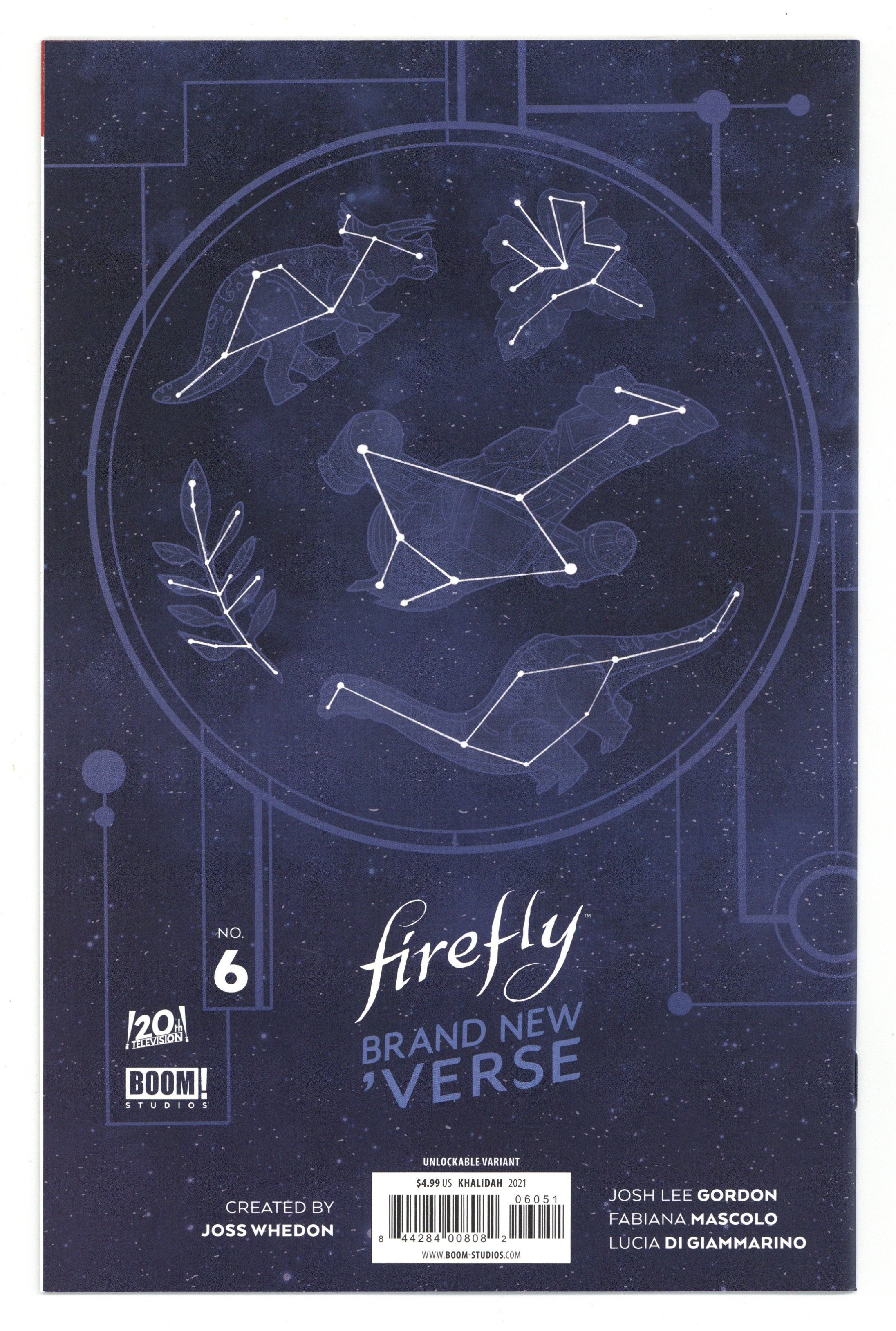 Published Aug 2021 by Boom Studios.$6.00Written by Josh Lee Gordon. Art by Fabiana Mascolo. Cover by Qistina Khalidah. The Final Battle is here! Who will come out the other side? Zoe and Emma's struggle to reunite may result in far reaching effects on a new system while Inara's role is still in question. A trap is set… but is it for Emma and her crew or Blue Sun? 24 pages, full color.
