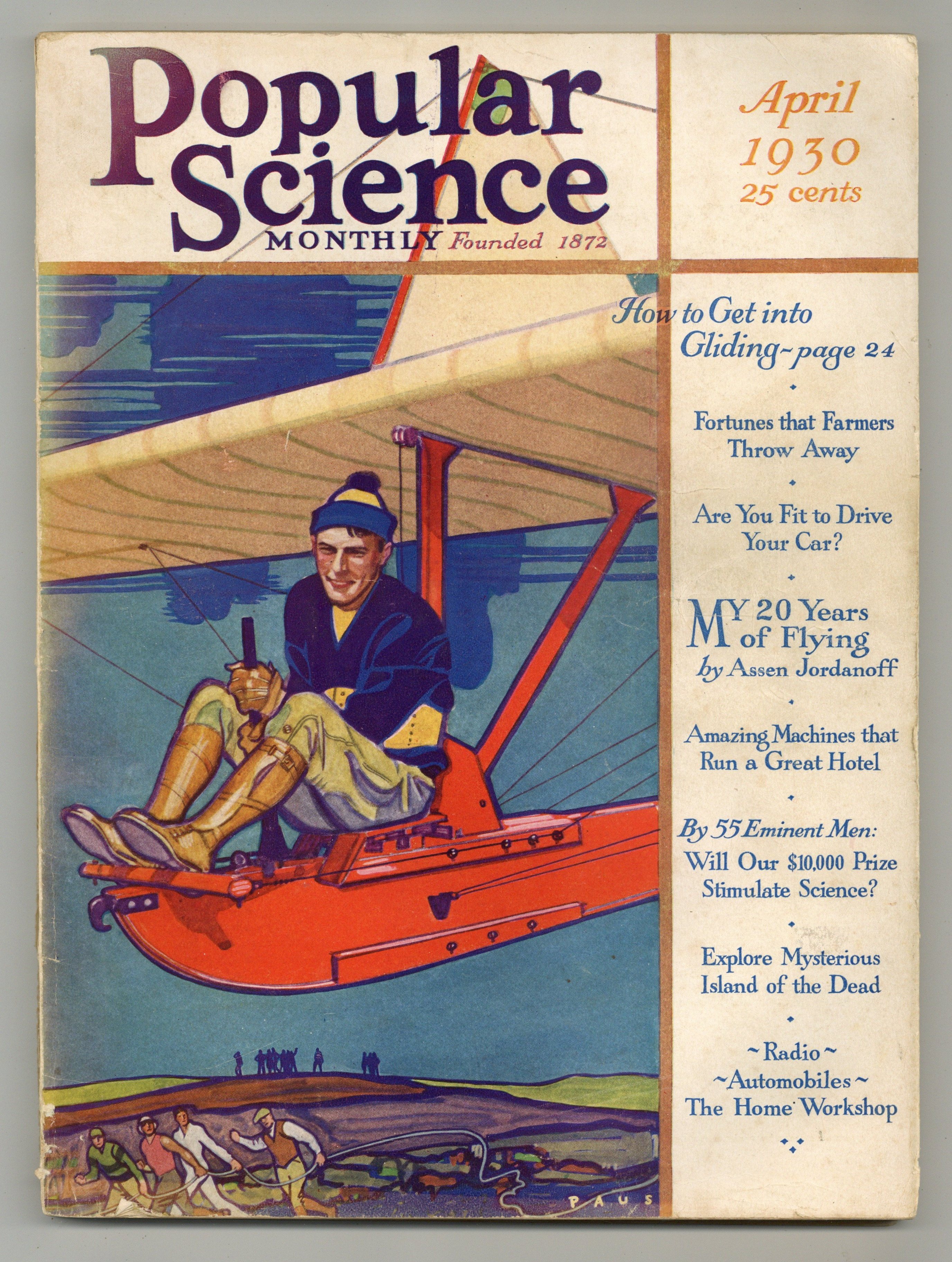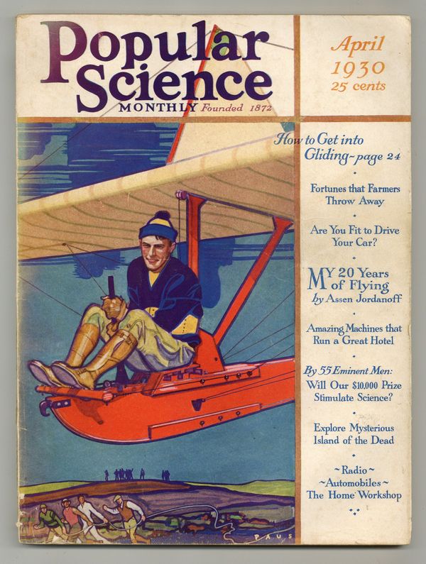 Published Apr 1930 by Popular Science Publishing Co..$2.65Vol. 116 #4 - Apr. 1930. Cover by Herbert Paus. Sections include aviation, astronomy, automobiles, models, radio, photography, ships, woodworking, inventions and more. 8.5-in. x 11.5-in., 160 pages, black and white. Cover price $0.25.