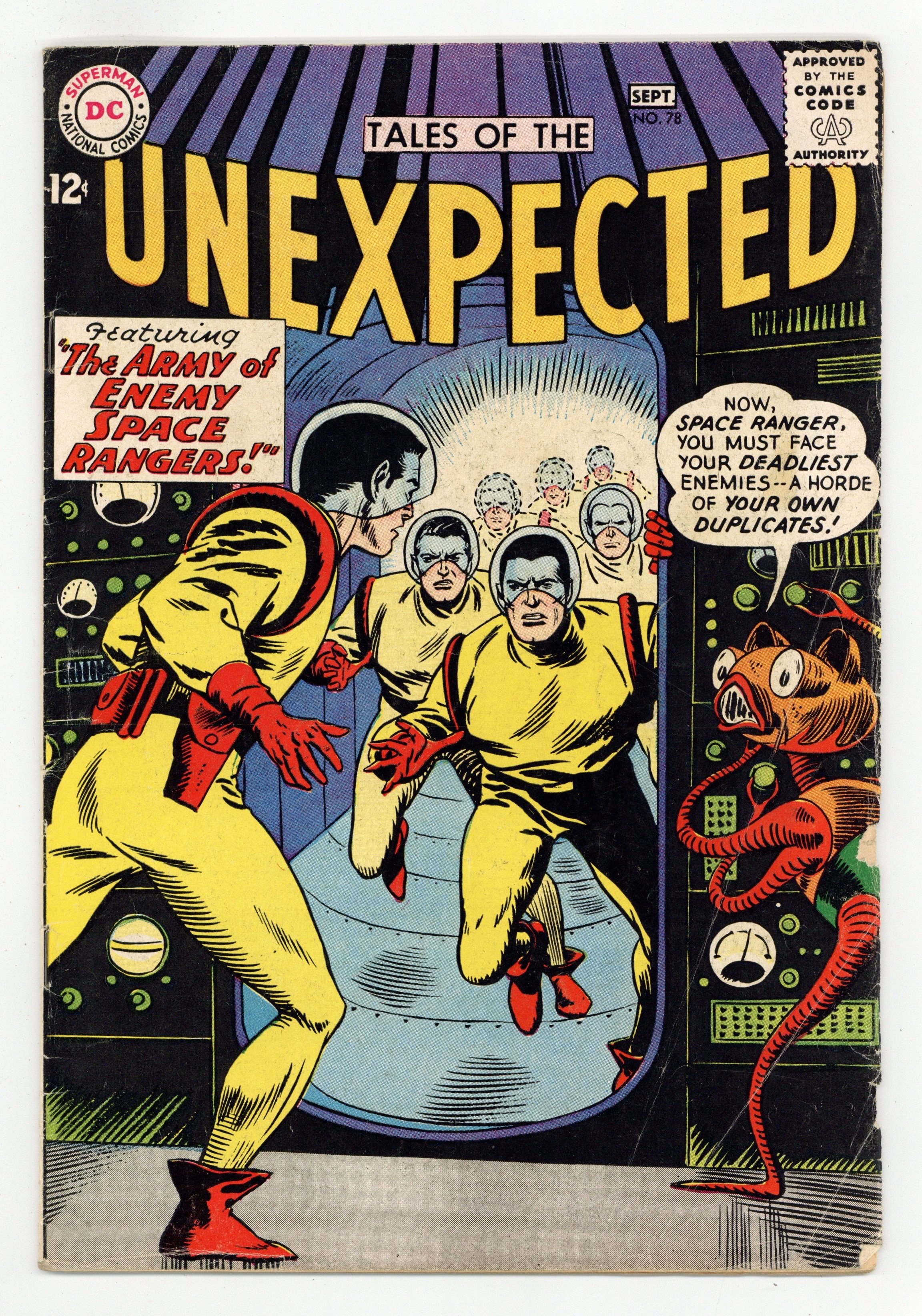 Cover art by Bob Brown. The Siren of Space, art by George Roussos; Space pilot Harlow Jones is sent to investigate a planetoid where a beautiful girl forces spaceships to crash, like the mythical sirens. House ad for Superman Annual #7, pencils by Curt Swan. House ad for Batman Annual #5, pencils by Sheldon Moldoff and Dick Sprang, inks by Charles Paris and Stan Kaye. The Space Mechanic featuring Spaceman-at-Work, art by Howard Sherman. Mystery of the Cosmic Rays fact page. The Army of Enemy Space Rangers starring Space Ranger, art by Phil Kelsey. 36 Pages, Full Color. Cover price $0.12.