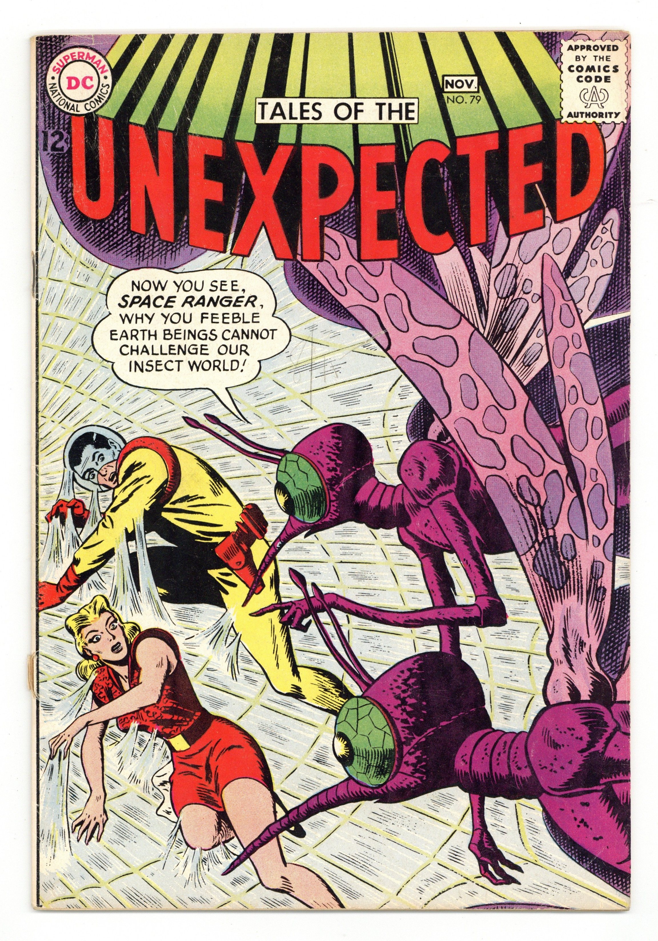 Cover art by Bob Brown. Play It Safe! public service announcement about forest rangers, script by Jack Schiff, art by Sheldon Moldoff. The Big Show on Planet Earth, art by Howard Sherman; An alien actor with the power to change his appearance (but not to change back without special pills) is framed for the murder of a theater manager. House ad for Flash Annual #1, pencils by Carmine Infantino. On the Planet Og humor page by Henry Boltinoff. Earth's Alien Traitor, art by George Roussos. Mysteries of the Comets fact page. Captives of the Insect-Men starring Space Ranger, art by Phil Kelsey. 36 Pages, Full Color. Cover price $0.12.