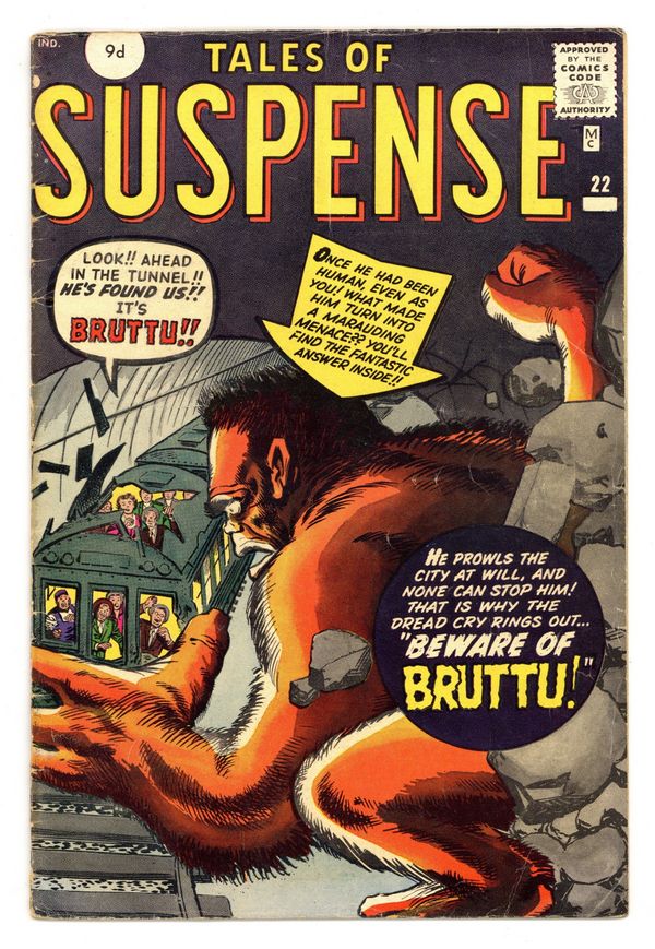 UK edition. Identical to US edition, but has 9d cover price. Cover pencils by Jack Kirby, inks by Steve Ditko. "Beware of... Bruttu," pencils by Jack Kirby, inks by Dick Ayers; An often bullied scientist accidentally transforms himself into a monster, and is attacked when he cant make himself understood; In his new form he discovers that the girl hed thought out of his league really loves him, and manages to make himself human again. "Mystery Trip" text story, art by Joe Maneely. "Only One Is Human!", art by Don Heck; A human unit on Mars realises that a disguised Martian is in their midst, they cannot tell the imposter and the real human apart, until a false piece of bad news makes the real human weep, uncovering the Martian. "The Anatomy of a Nightmare!", script by Stan Lee, art by Steve Ditko; A science fiction writer is stuck, so he takes some pills, hoping a nightmare will inspire him; He dreams of horrible red-eyed aliens, but is disappointed, since that's only his own dull world. 36 pgs., full color.