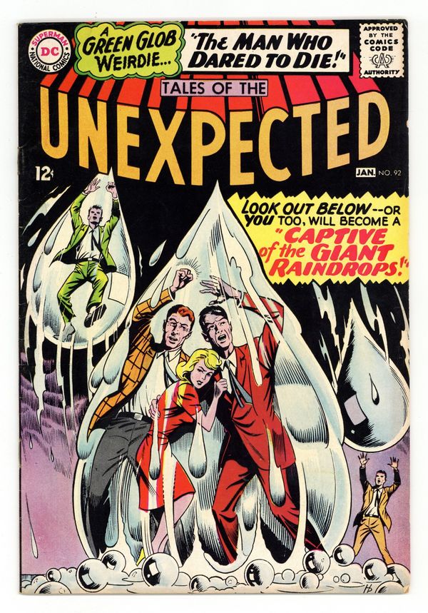 Cover art by Howard Purcell. Builders of the Future! UNESCO public service announcement, script by Jack Schiff, art by Sheldon Moldoff. The Man Who Dared to Die!, art by George Roussos; The Green Glob provides Brian Desmond with a second chance to acquire an other-dimensional charm said to bring good fortune, but when he discovers that his good fortune always causes trouble for others, he relinquishes it. House ad for Batman #176. The Town That Went Crazy!, art by Jack Sparling; Former soldier Roger Weire discovers that his old G.I. helmet protects him from some strange rays that are causing everyone in town to act wildly. Captive of the Giant Raindrops!, art by Howard Purcell. 36 pgs. $0.12. Cover price $0.12.