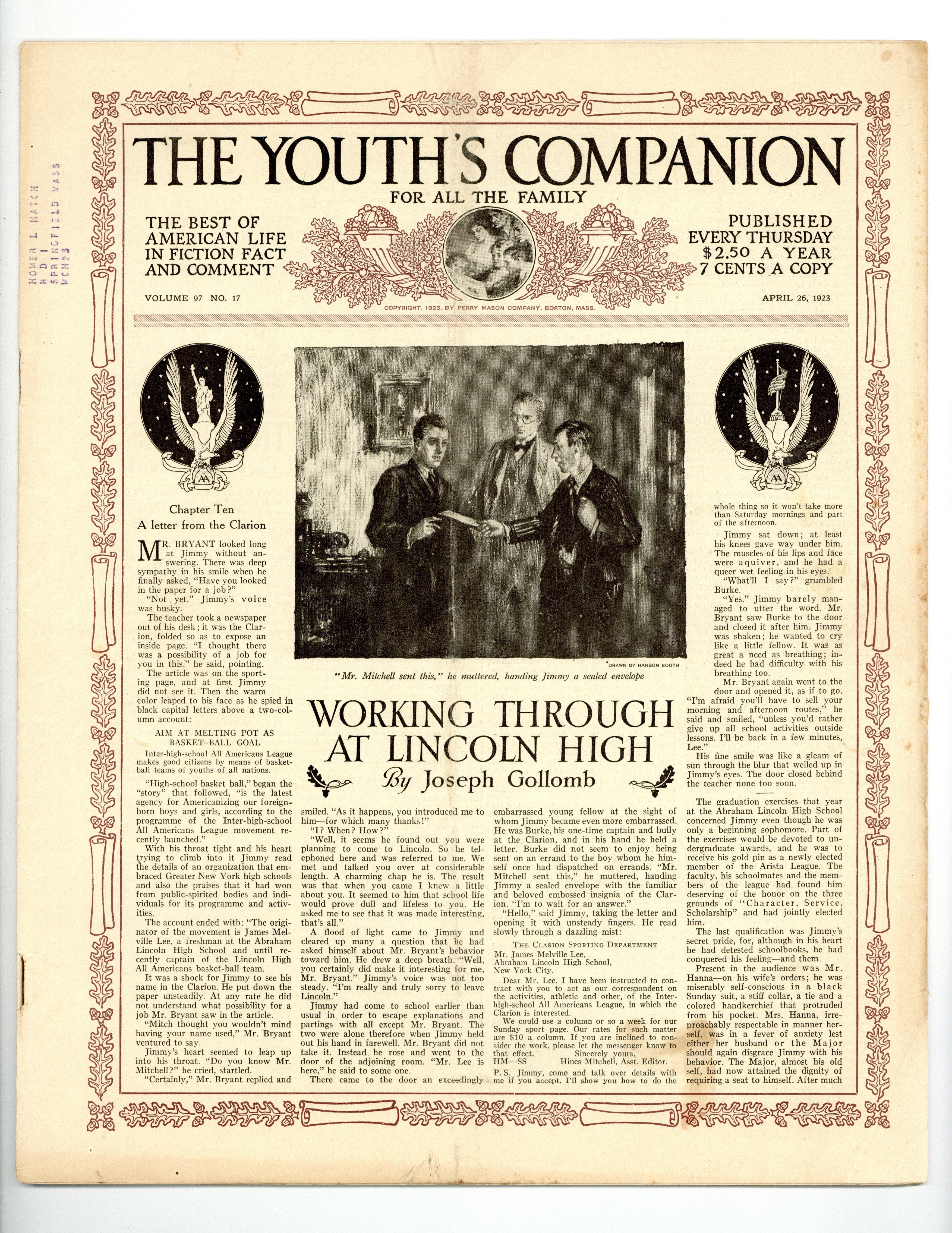 Published Apr 1923 by Perry Mason Company.$2.50Volume 97, Issue 17 - April 26, 1923. Cover by Hanson Booth. This issue's stories include; "Little Trousers" by Mabel Fletcher Head, "An Affair at Two-Ocean Pass" by Horace Chadbourne, "The Largest Zoological Garden" by Harry H. Dunn, "The Chimera of Wittee Lake" by Archibald Rutledge, and more. 11" x 13.5", 16 pages, B&W. Cover price $0.07.