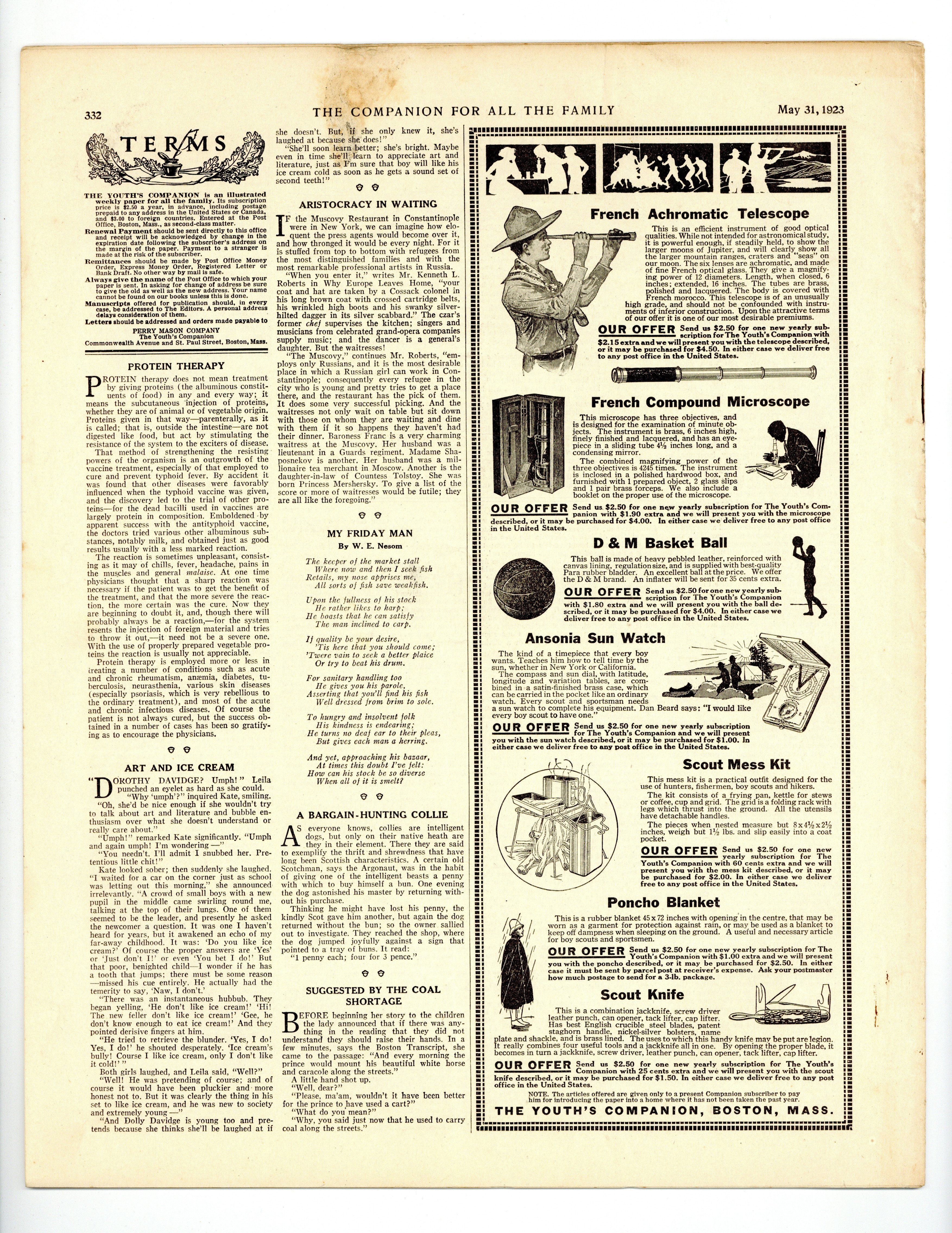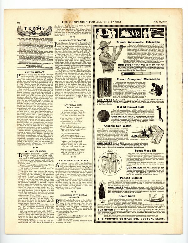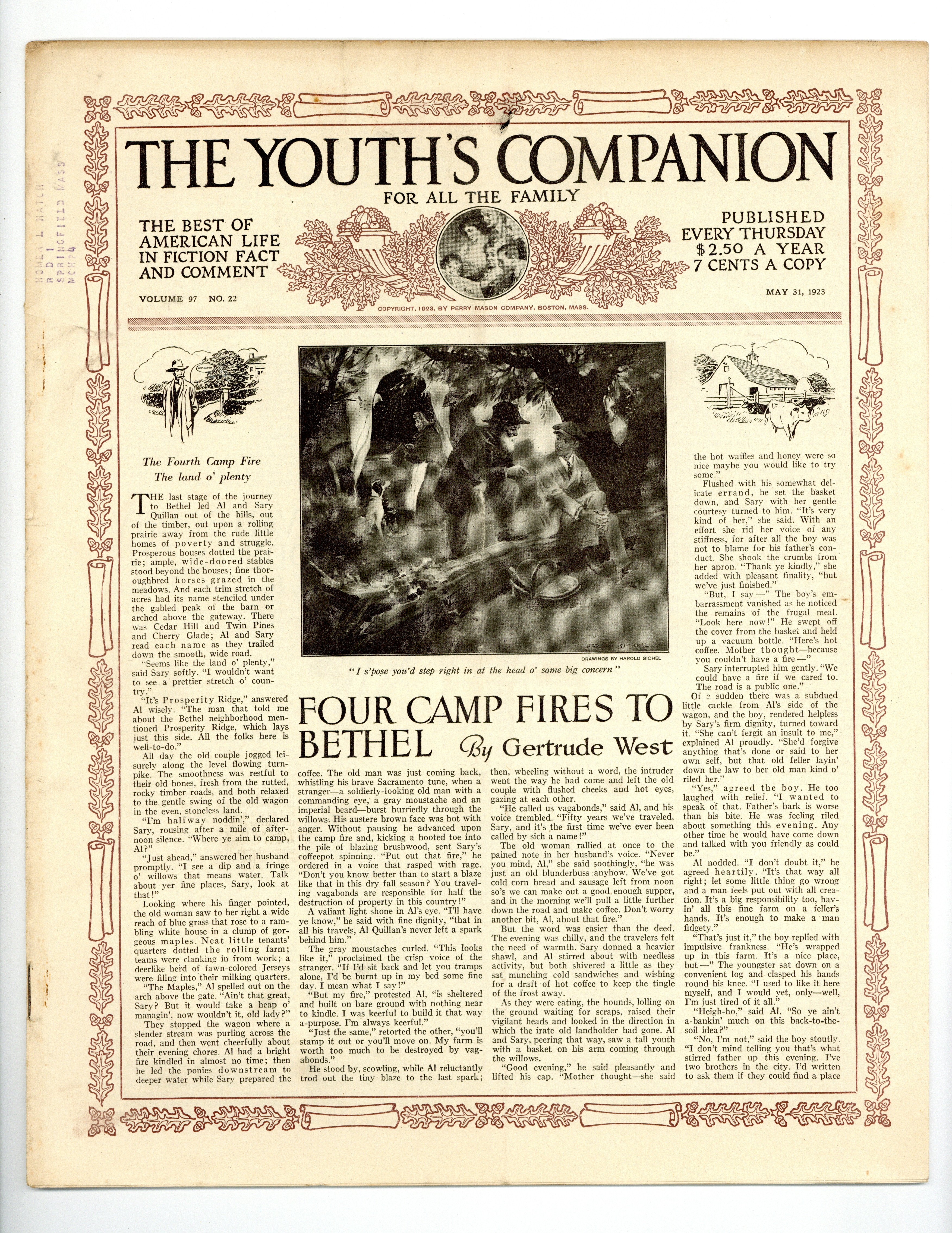 Published May 1923 by Perry Mason Company.$13.00Volume 97, Issue 22 - May 31, 1923. Cover by Harold Sichel. This issue's stories include; "Four Campfires to Bethel: Chapter IV" by Gertrude West, "The Valley City Rodeo Stunt" by Louis Felix Ranlett, "The Strength of Union" by Maurice Francis Egan, "The Chimera of Wittee Lake: Chapter VI" by Archibald Rutledge, "The Little Gray Box" by Zelia M. Walters, and more. 11" x 13.5", 16 pages, B&W. Cover price $0.07.