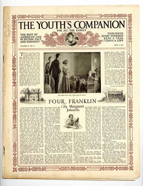 Volume 97, Issue 27 - July 5, 1923. Cover by O.F. Howard. This issue's stories include; "The strangest of Wedding Journeys: Chapter III" by C.A. Stephens, "Four, Franklin" by Margaret Johnson, "Puh-Poom" by James Willard Schultz, "Some Interesting People I Have Met" by Rev. Francis E. Clark, D.D., "Tide-Runners" by George M. Johnson, and more. 11" x 13.5", 16 pages, B&W. Cover price $0.07.
