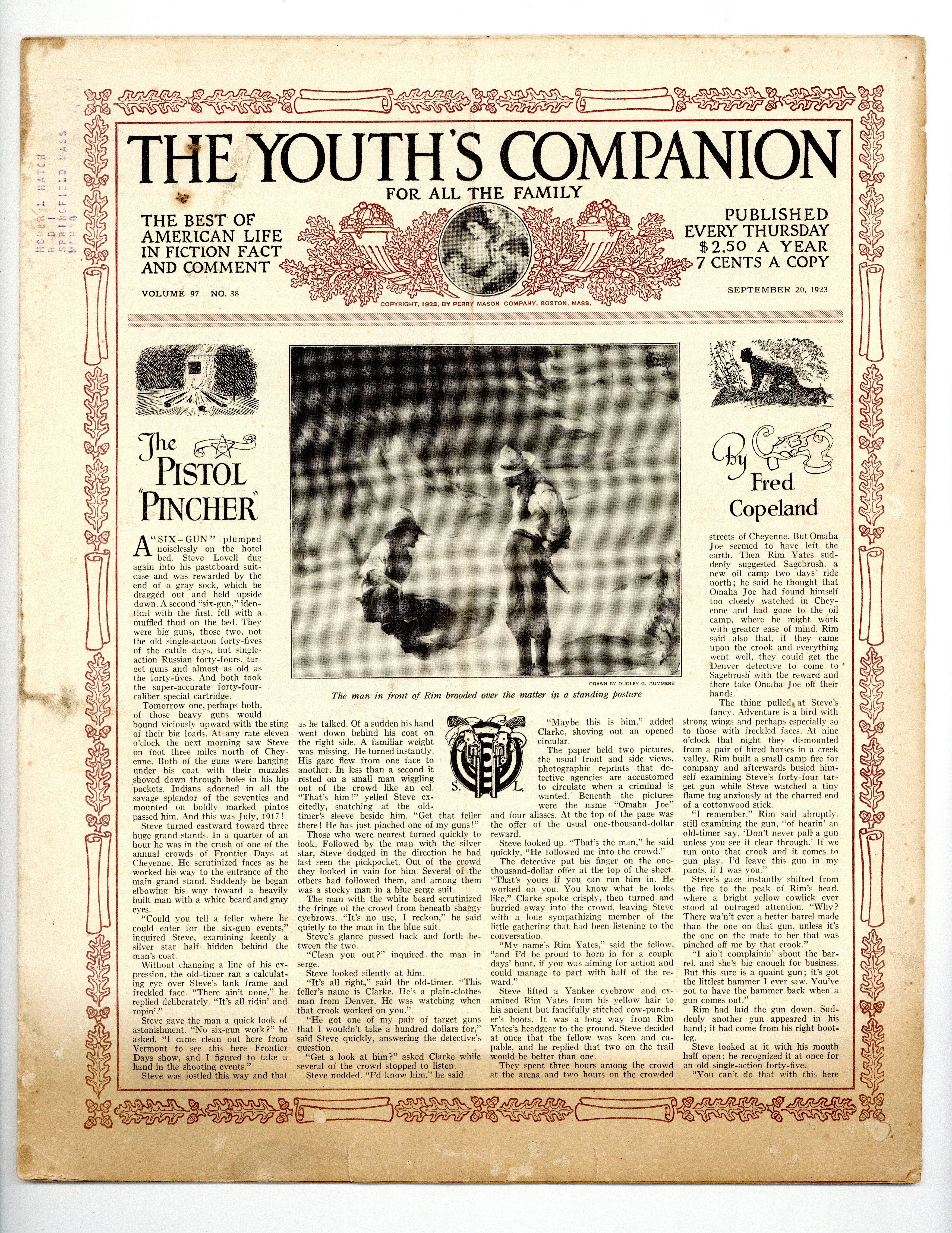Volume 97, Issue 38 - September 20, 1923. Cover by Dudley G. Summers. This issue's stories include; "The Pistol Pincher" by Fred Copeland, "Ralph Illinson: Chapter VIII" by Arthur Stanwood Pier, "The Jewel Box: Chapter IV" by Gertrude West, "Precious Platinum: Chapter I" by C.A. Stephens, and more. 11" x 13.5", 16 pages, B&W. Cover price $0.07.