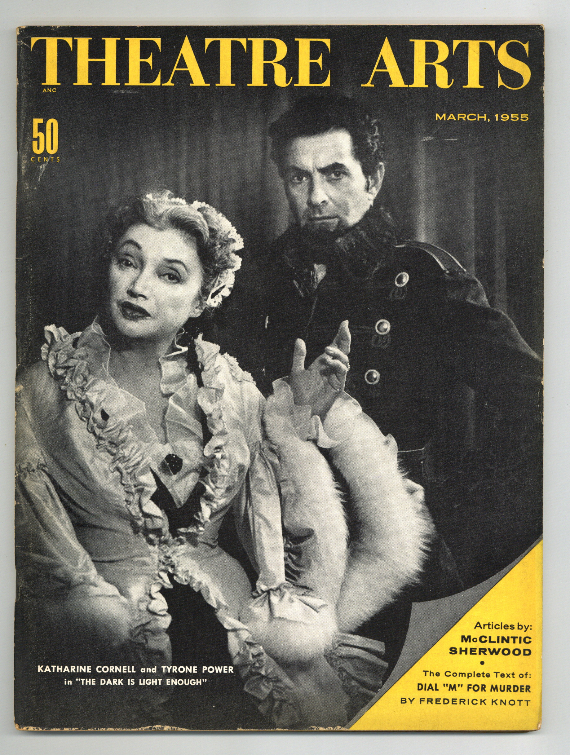Volume 39, Issue 3 - March, 1955. Katharine Cornell and Tyrone Power photo cover. Theatre Arts Monthly is legendary for its thorough and insightful coverage of the stage, both in American and England. Less well-known is the fact that TAM also provided some outstanding coverage of motion pictures, Broadway and Hollywood. This "Special French Issue" includes a complete version of "Dial "M" For Murder" by Frederick Knott, as well as articles by Gilbert V. Hartke, George N. Shuster, Hjalmar H. Boyesen, Guthrie McClintic, Robert E. Sherwood, more. 8.5" x 11", 96 pages, B&W. Cover price $0.50.