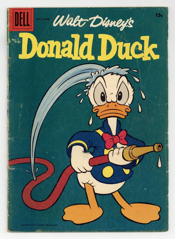 Published Aug 1958 by Dell/Gold Key/Whitman.$26.0015¢ edition. Cover by Paul Murry. Stories and art by Carl Barks, Jack Bradbury, and Tony Strobl. The classic adventures of Disney's Donald Duck, featuring art by Carl Barks and other great Disney artists. After gigantic ants disrupt the Billionaires' Picnic, Scrooge and Donald trace them back to Doctor Thinknoble and his enlarging machine. Clarabelle Cow helps Goofy clean his house. Donald competes in a water-skiing race to be Daisy's escort to the Water Festival. Baseball Watching; Donald Duck and the Titanic Ants!; Water Ski Race; The Big Gun; Goofy: Tidy Friday. 32 pages, Full Color. Cover price $0.15.