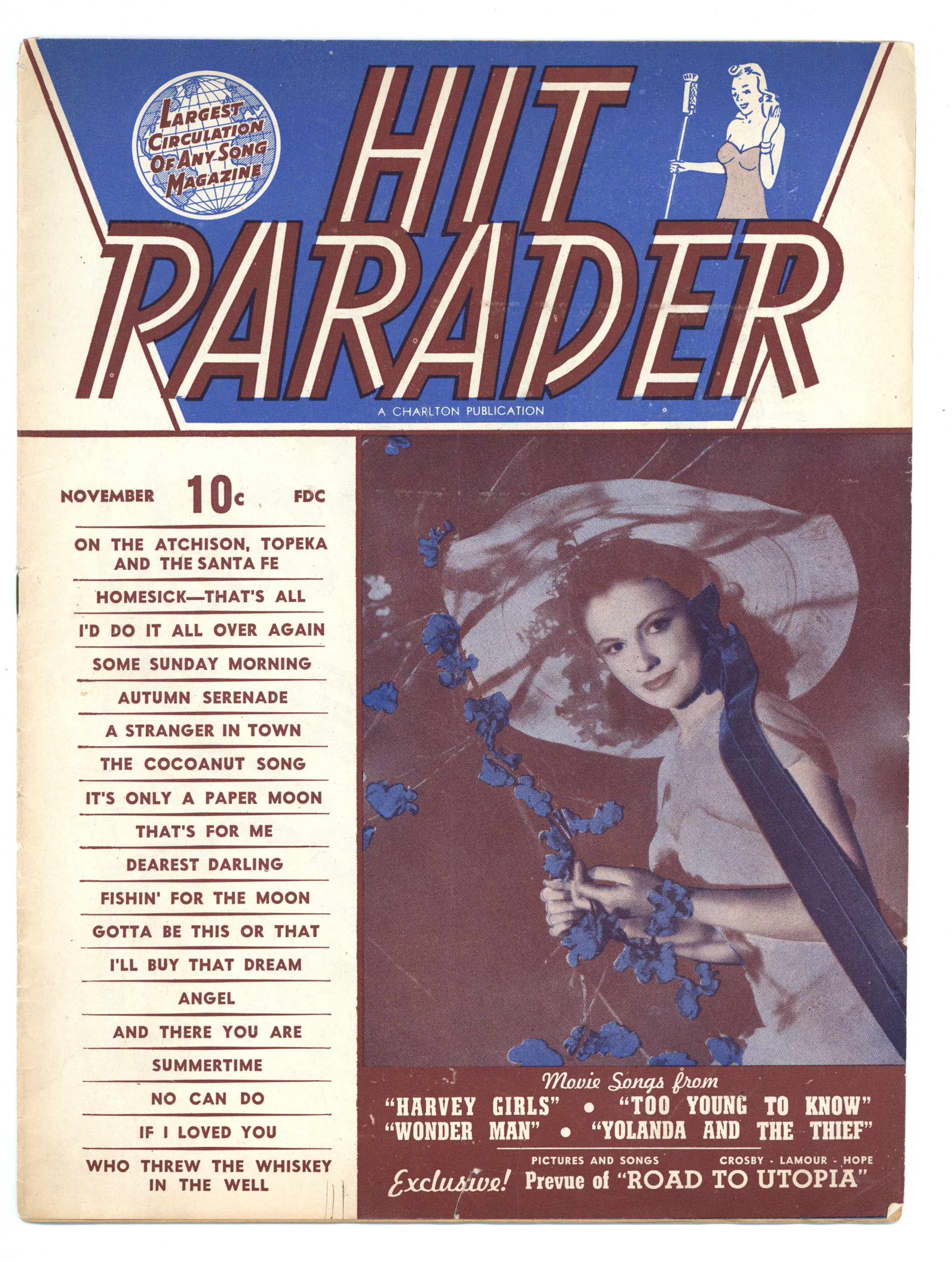 Volume 4, Issue 1 - November, 1945. Long running magazine that features song lyrics, celebrity gossip, articles, and fan letters. This issue features songs from motion pictures such as; "Harvey Girls", "Too Young to Know", "Wonder Man", "Yolanda and the Thief", and many more. 8.5" x 11", 18 pages, B&W Cover price $0.10.