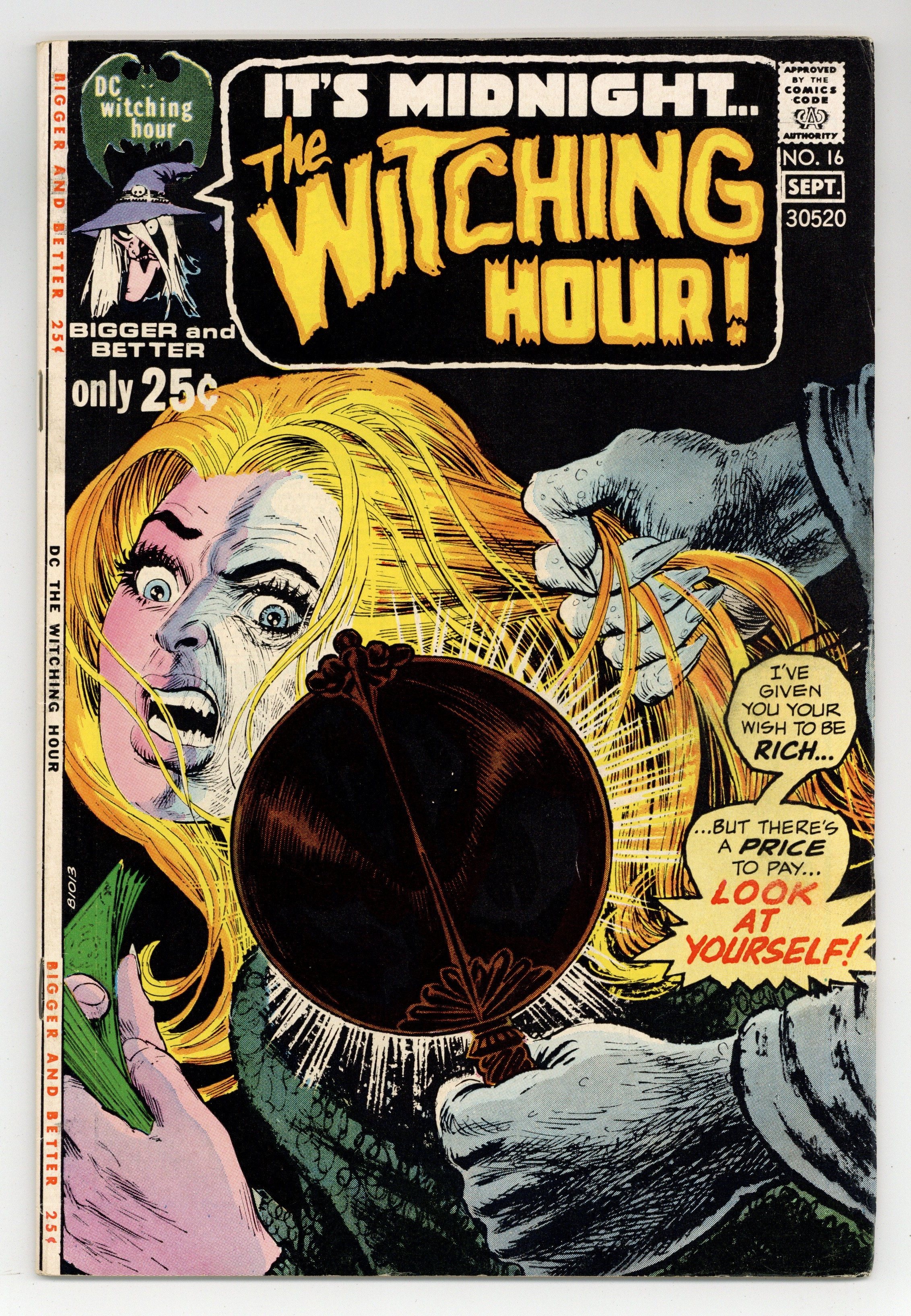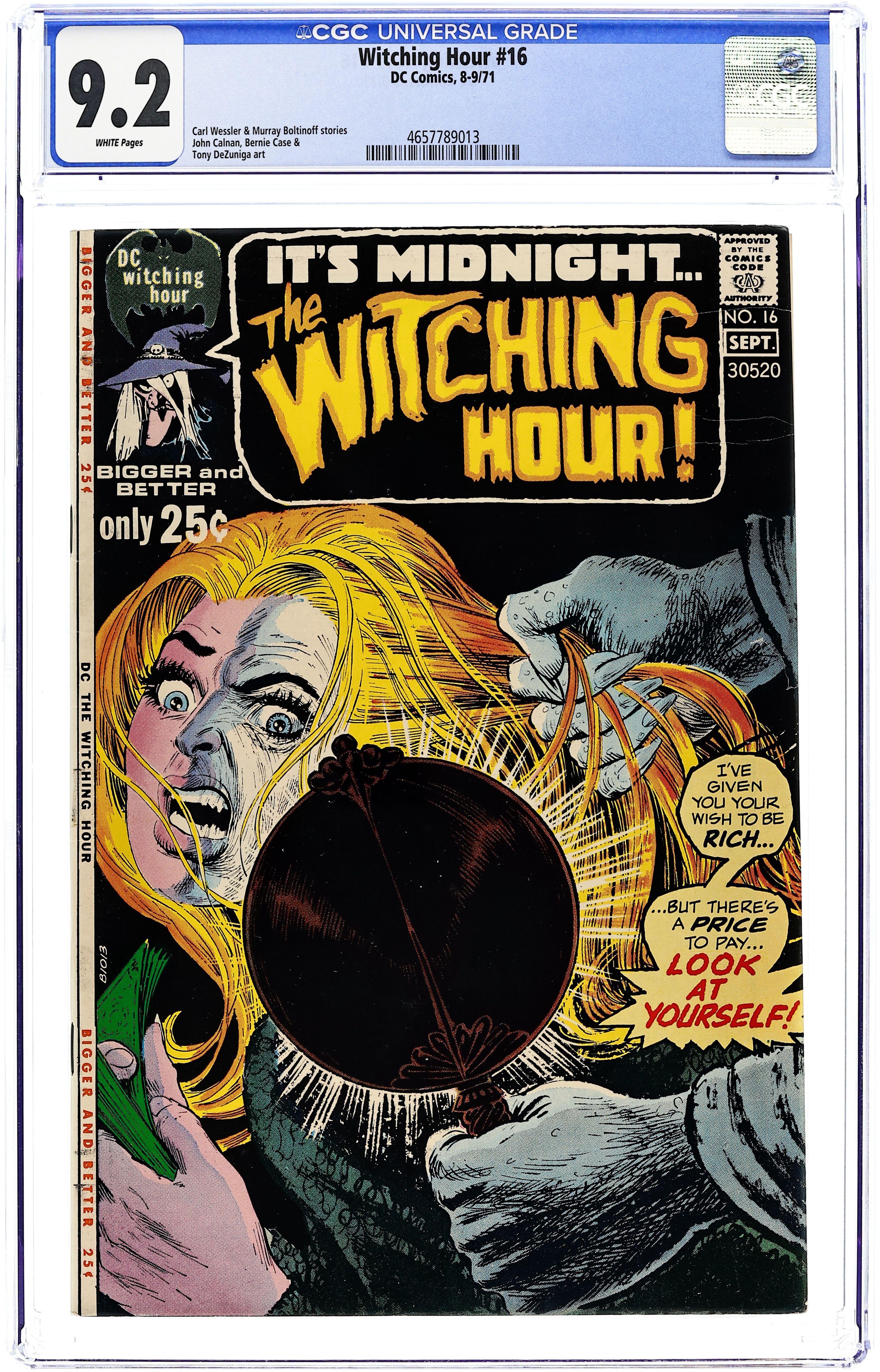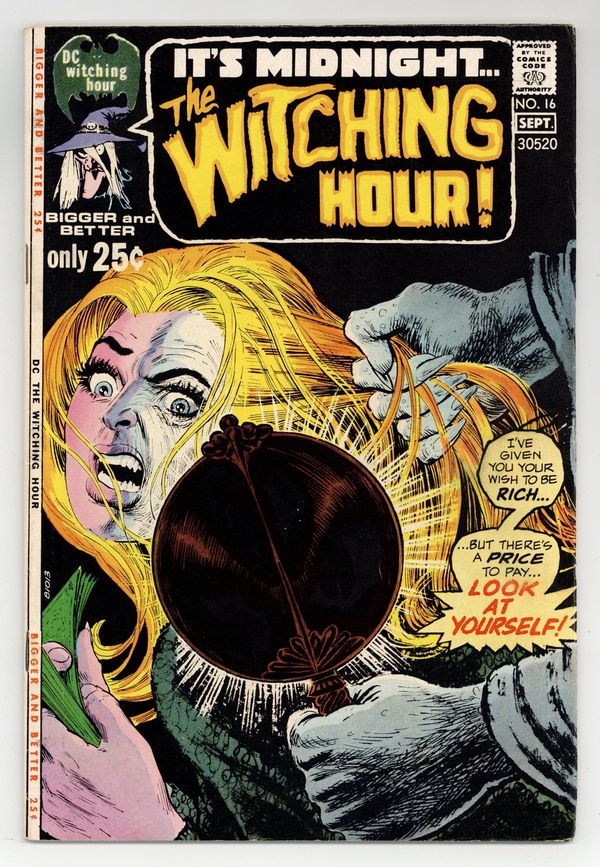 $19.0052-page giant. "Never Kill a Witch!" (script by Carl Wessler, pencils by John Calnan, inks by Bernie Case); "The Spell of Sinner Ella!" (script by Bill Dennehy, art by Gray Morrow); "You Can't Hide From Death" (script by Al Case, art by Tony DeZuniga); "The Wondrous Witch's Cauldron"; "The Curse of the Cat" (script by Howie Post, art by Bill Draut); and a one-page text story, "Last Meal" by Charles King (accompanied by a full-page illustration by Joe Orlando). 52 Pages, Full Color. Cover price $0.25.