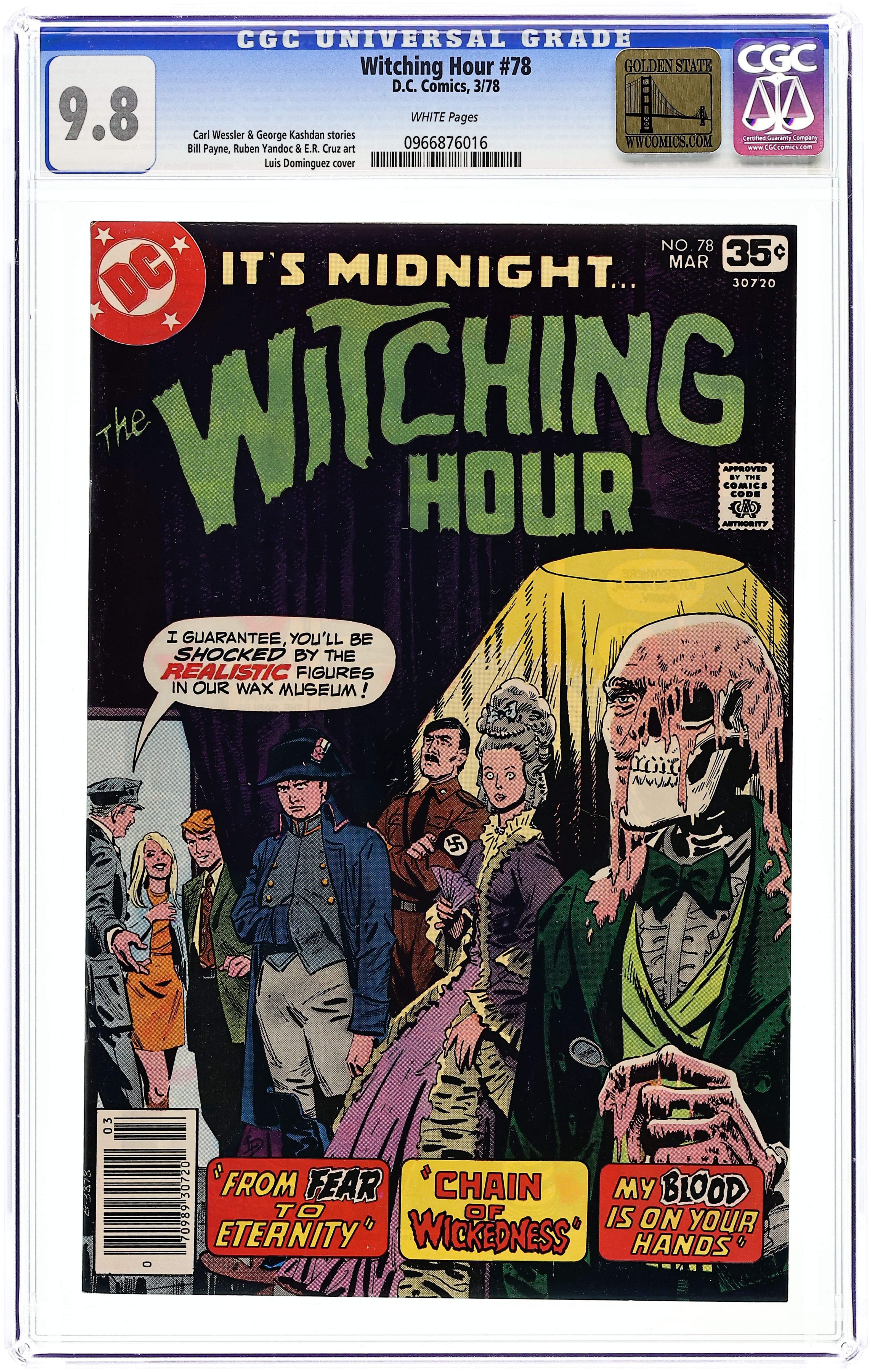 Featuring: 1 page The Three Witches introductory story drawn by E.R. Cruz; 5 page story "From Fear to Eternity" written by Carl Wessler and drawn by Bill Payne; 3 page story "My Blood is on Your Hands" written by George Kashdan and drawn by Ruben Yandoc; 8 page story "Chain of Wickedness" written by George Kashdan and drawn by E.R. Cruz. Cover by Luis Dominguez. 36 Pages, Full Color. Cover price $0.35.
