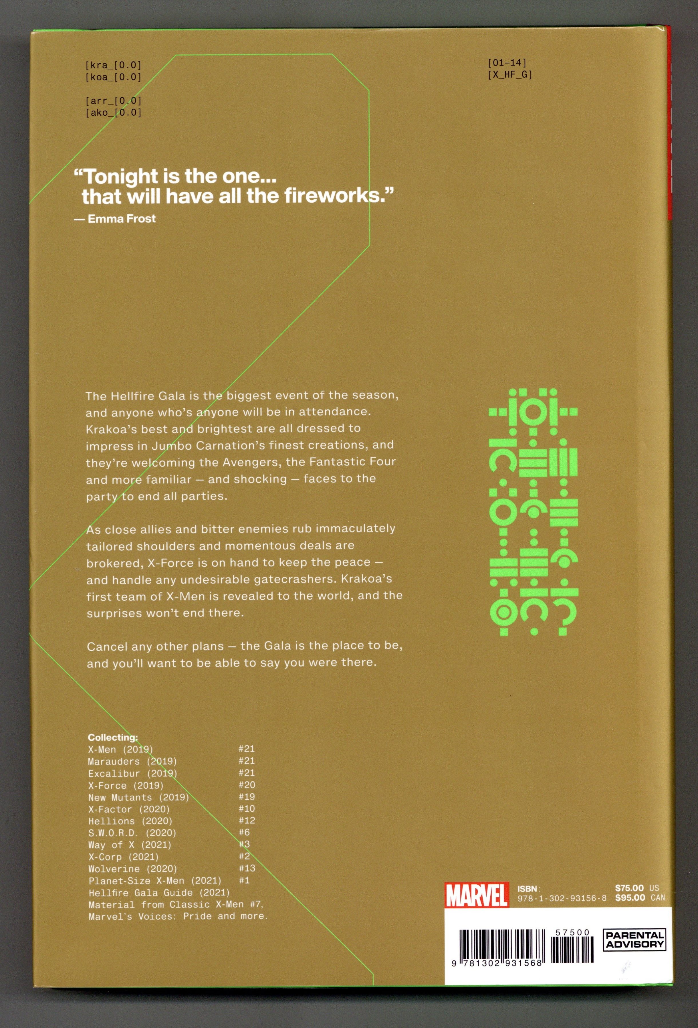 1st printing. Collects Marauders (2019 Marvel) #21, X-Force (2019 Marvel) #20, Hellions (2020 Marvel) #12, Excalibur (2019 Marvel) #21, X-Men (2019-2021 Marvel) #21, Planet-Size X-Men (2021 Marvel) #1, New Mutants (2019 Marvel) #19, X-Corp (2021 Marvel) #2, Wolverine (2020 6th Series) #13, S.W.O.R.D. (2021 Marvel) #6, Way of X (2021 Marvel) #3, X-Factor (2020 Marvel) #10, Hellfire Gala Guide; "Equality," "Over Served," "The Best Offense," "Popularity Contest," "New X-Man" comic strips; material from X-Men Classic (1986-1995 Marvel) Classic X-Men #7, and Marvel's Voices: Pride (2021 Marvel).