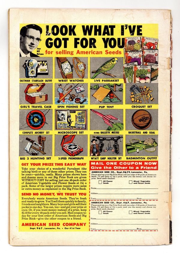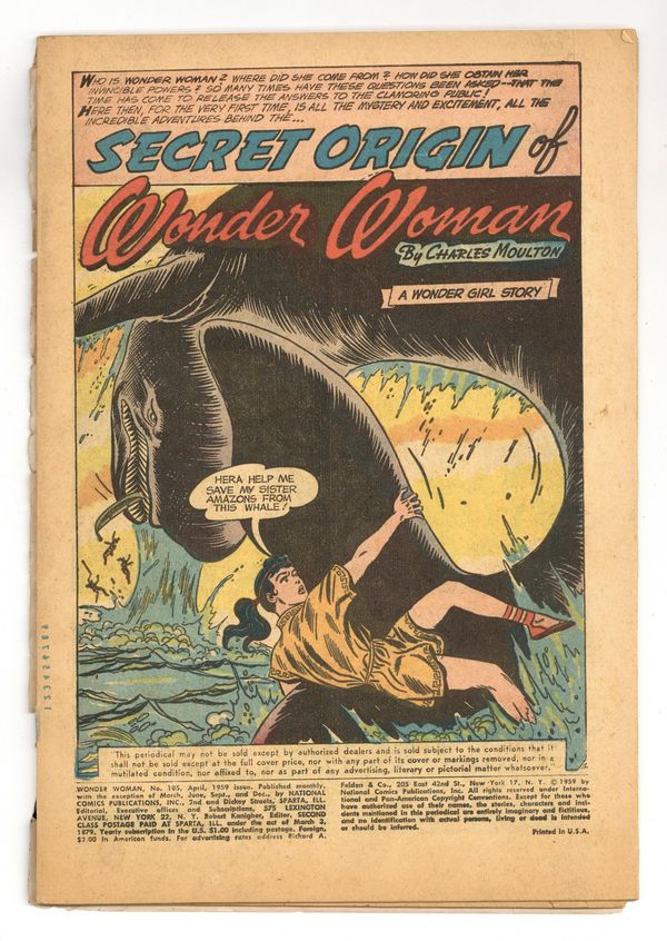 "Who is Wonder Woman? Where did she come from? How did she obtain her invincible powers? So many times have these questions been asked--that the time has come to release the answers to the clamoring public! Here then, for the very first time, is all the mystery and excitement, all the incredible adventures behind the ...Secret Origin of Wonder Woman" Wonder Woman appears as a girl with no costume (yet), and is called Wonder Girl. Back-up WW story, "Eagle of Space!" Pencils by Ross Andru, inks by Mike Esposito. 36 pages, Full Color. Cover price $0.10.