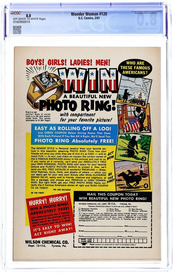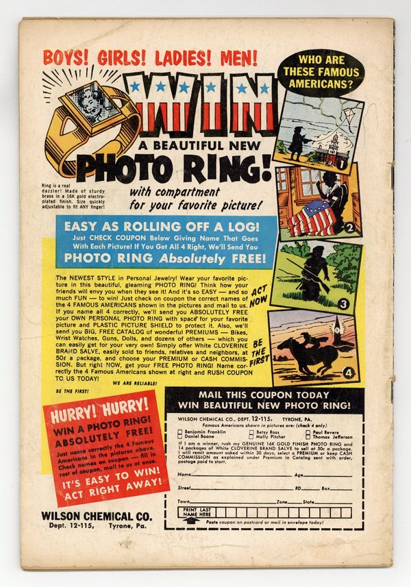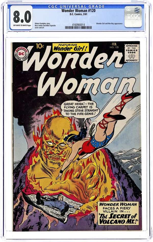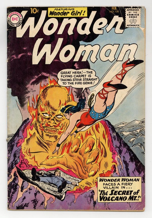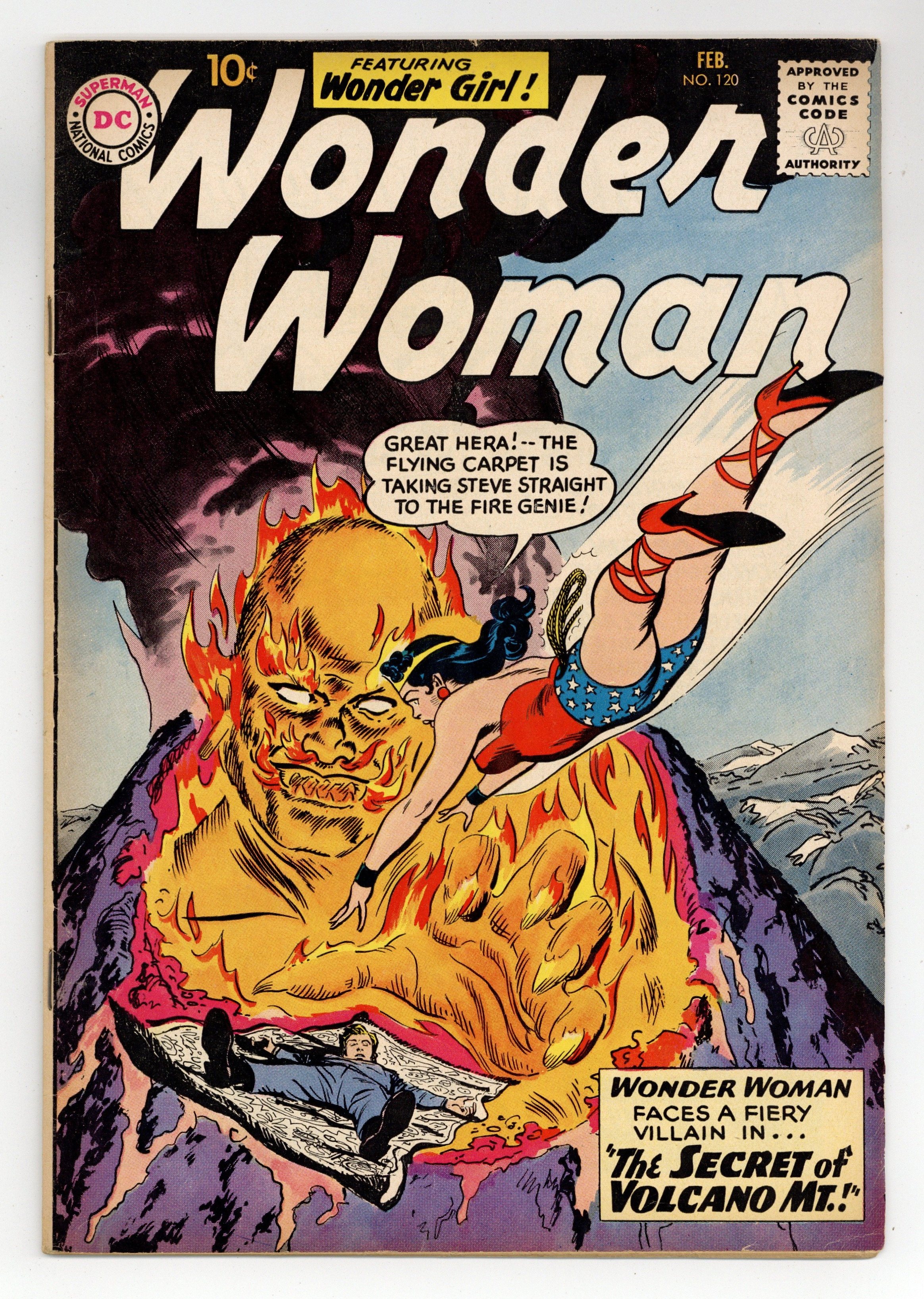 Cover pencils by Ross Andru, inks by Mike Esposito. "The Secret of Volcano Mountain," script by Robert Kanigher, pencils by Ross Andru, inks by Mike Esposito; Wonder Girl battles strange creatures from Mercury. Statement of Ownership by Jack Liebowitz; average sales 213,000. Our American Heritage public service announcement, script by Jack Schiff, art by Bernard Baily. "Part 2: The Secret of Volcano Mountain," script by Robert Kanigher, pencils by Ross Andru, inks by Mike Esposito; Wonder Girl continues to battle strange creatures from Mercury. "Part 3: The Secret of Volcano Mountain," script by Robert Kanigher, pencils by Ross Andru, inks by Mike Esposito; Wonder Girl defeats the Mercurian Menace only to have it to return years later to face Wonder Woman. Statement of ownership - average paid circulation 213,000. Full-page ad for Justice League of America 3. 36 pages, Full Color. Cover price $0.10.