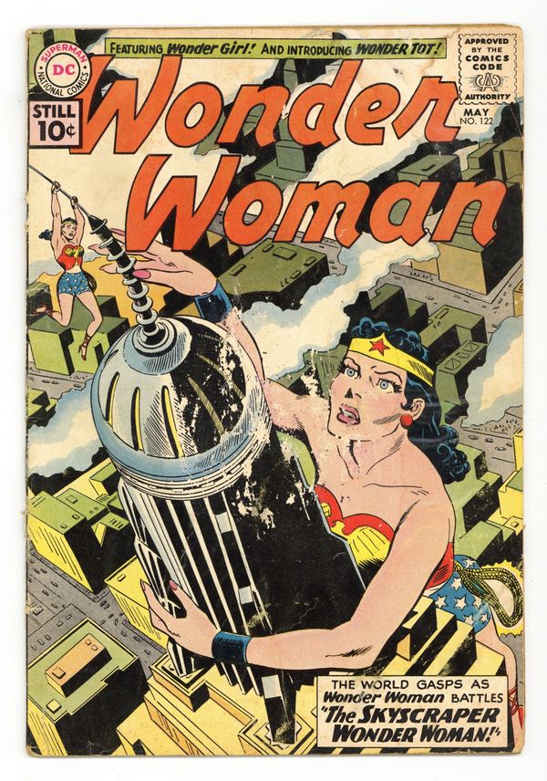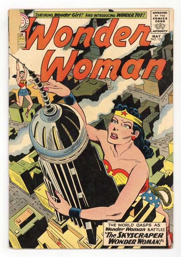 Cover pencils by Ross Andru, inks by Mike Esposito. First appearance of Wonder Tot in "The Skyscraper Wonder Woman," script by Robert Kanigher, pencils by Ross Andru, inks by Mike Esposito; The Sinister Seer of Saturn seeks revenge against Wonder Woman for having been deposed and exiled; He unleashes a mysterious space capsule on the unsuspecting Amazon; The capsule contains a gigantic Wonder Woman doll. "Part Two: The Skyscraper Wonder Woman!", script by Robert Kanigher, pencils by Ross Andru, inks by Mike Esposito; The Skyscraper Wonder Woman goes on a rampage across the Earth and chases Wonder Woman up the Empire State Building. "Part Three: The Skyscraper Wonder Woman!", script by Robert Kanigher, pencils by Ross Andru, inks by Mike Esposito; Wonder Woman is captured and taken to Saturn where she must face three challenges from the Seer. 36 pages, Full Color. Cover price $0.10.