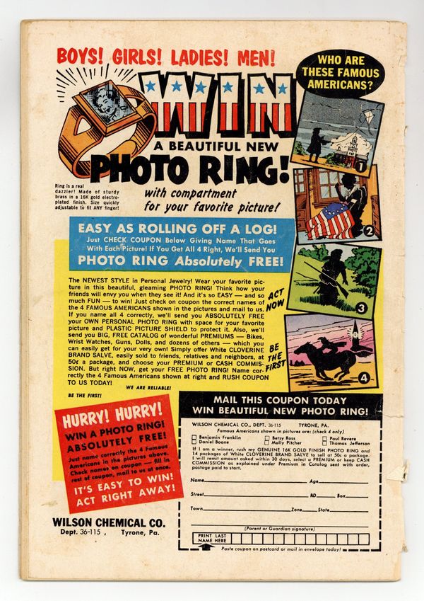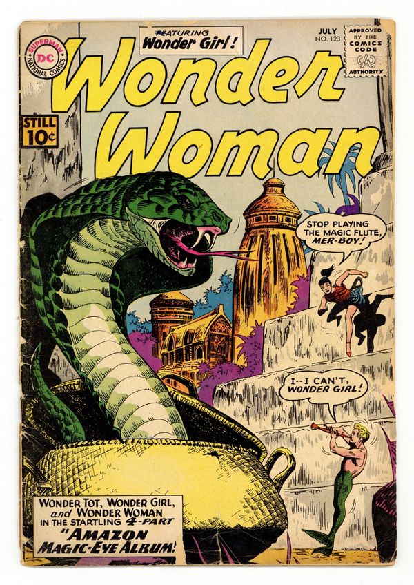 Starts Dec 8 Cover pencils by Ross Andru, inks by Mike Esposito. "Amazon Magic Eye Album," script by Robert Kanigher, pencils by Ross Andru, inks by Mike Esposito; Wonder Woman and Queen Hippolyte go through Wonder Womans photo album, reliving adventures of Wonder Tot and Wonder Girl, and having a new adventure in which the Amazon Princess enters a world within a photograph. Peg humor half-page by Henry Boltinoff. 36 pages, Full Color. Cover price $0.10.