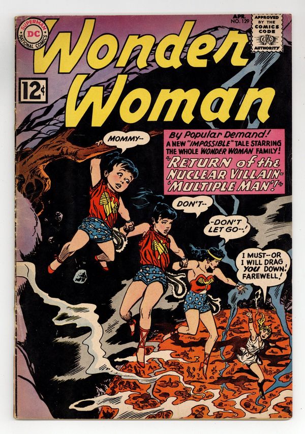 Cover pencils by Ross Andru, inks by Mike Esposito. The entire Wonder Woman family - Wonder Woman, Wonder Girl, Wonder Tot, and Queen Hippolyta - star in "The Return of Multiple Man," script by Robert Kanigher, pencils by Ross Andru, inks by Mike Esposito; Wonder Woman and Queen Hippolyta splice together the second "Impossible Tale," featuring themselves teamed with Wonder Tot and Wonder Girl against Multiple Man again. Do You Know Your Neighbors? public service announcement starring Buzzy, script by Jack Schiff, art by Win Mortimer. 36 pages, Full Color. Cover price $0.12.