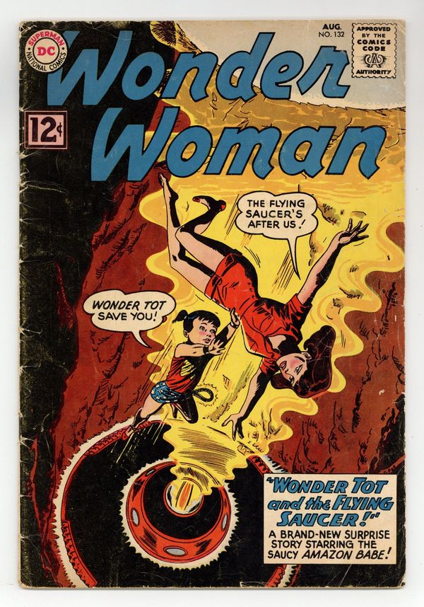 Cover pencils by Ross Andru, inks by Mike Esposito. "Wonder Tot and the Flying Saucer!", script by Robert Kanigher, pencils by Ross Andru, inks by Mike Esposito; Wonder Woman discovers a baby on a deserted beach next to a smoking crater; Only the baby can explain what happened so Wonder Woman becomes Wonder Tot so she can communicate with the infant and rescue her missing baby sitter. "Wonder Queen Fights Hercules!", script by Robert Kanigher, pencils by Ross Andru, inks by Mike Esposito; After Wonder Woman confesses the problem she has with her rival suitors, Steve Trevor and Manno the Merman, Queen Hippolyta tells her about the time in the distant past in which Hercules tried to win her hand. 36 pages, Full Color. Cover price $0.12.