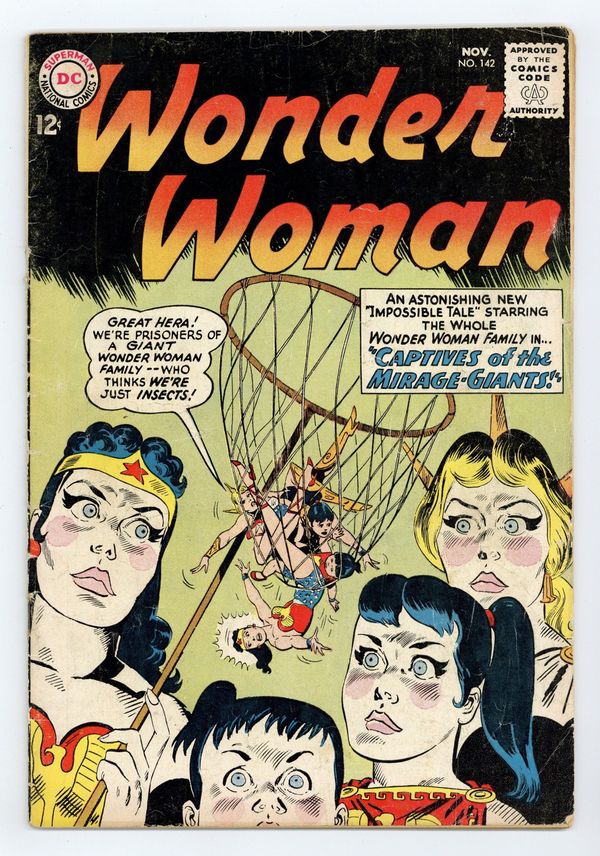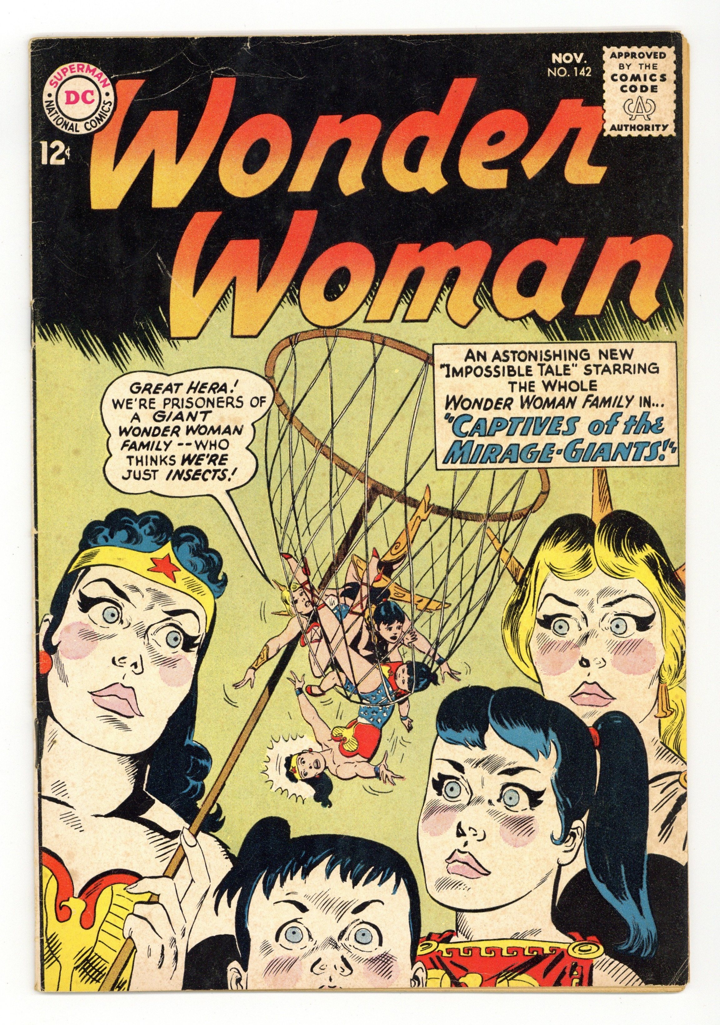 Cover pencils by Ross Andru, inks by Mike Esposito. The Wonder Woman family (Wonder Woman, Wonder Girl, Wonder Tot, and Wonder Queen) in an "impossible tale," "Captives of the Mirage World," script by Robert Kanigher, pencils by Ross Andru, inks by Mike Esposito; The Wonder Woman Family goes on a quest for a rare butterfly, only to find themselves the prey of a giant version of themselves from another world. 36 pages, Full Color. Cover price $0.12.