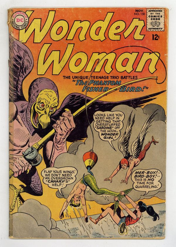 Cover pencils by Ross Andru, inks by Mike Esposito. "The Phantom Fisher-Bird," script by Robert Kanigher, pencils by Ross Andru, inks by Mike Esposito; Mer-Boy and Bird-Boy vie to see who's best which requires Wonder Girl to keep rescuing them and eventually Wonder Woman has to rescue all three of them from the King Fisherbird. Homer humor half-page by Henry Boltinoff. 36 pages, Full Color. Cover price $0.12.