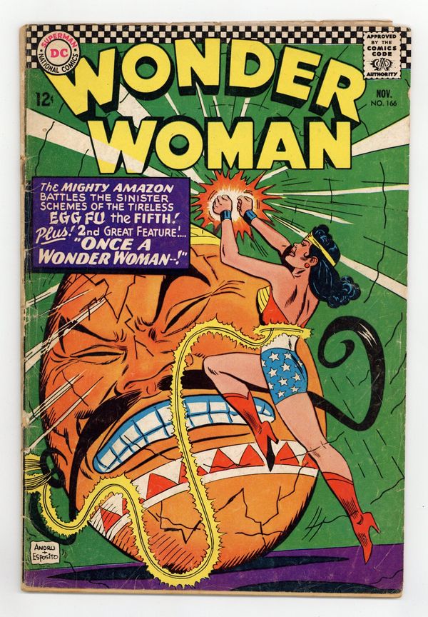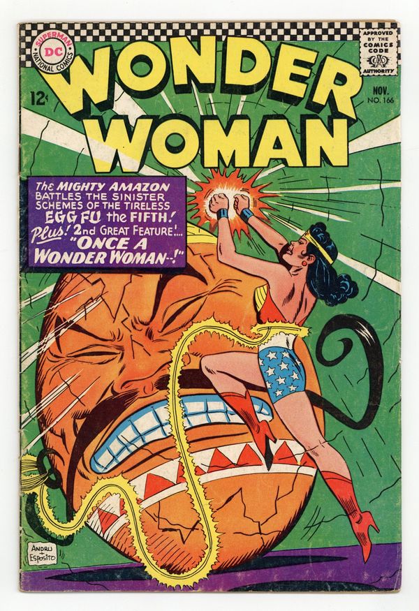 Tags: Wonder Woman$21.00Cover pencils by Ross Andru, inks by Mike Esposito. "The Sinister Scheme of Egg Fu, the Fifth," script by Robert Kanigher, pencils by Ross Andru, inks by Mike Esposito; Gen. Darnell sends Wonder Woman and Steve Trevor to sea in the Robot Plane to discover what became of a missing atomic sub; They are both captured by Egg Fu V, the latest in a line of Egg Fus, whose Red Chinese crew have stolen the sub under his direction; The villain holds Wonder Woman prisoner by her own Magic Lasso, but the Amazon asks to perform a dance for him in honor of his victory. "Once a Wonder Woman," script by Robert Kanigher, pencils by Ross Andru, inks by Mike Esposito; After Steve Trevor asks Diana Prince to ask Wonder Woman when she will marry him, Diana vows to make Steve fall in love with her, rather than her Wonder Woman identity; To this end, Diana, who has just been promoted to captain, stops a truck from crashing and attempts to stop a holdup gang. Letter to the editor from comics writer Mike Friedrich. 36 pages, Full Color. Cover price $0.12.