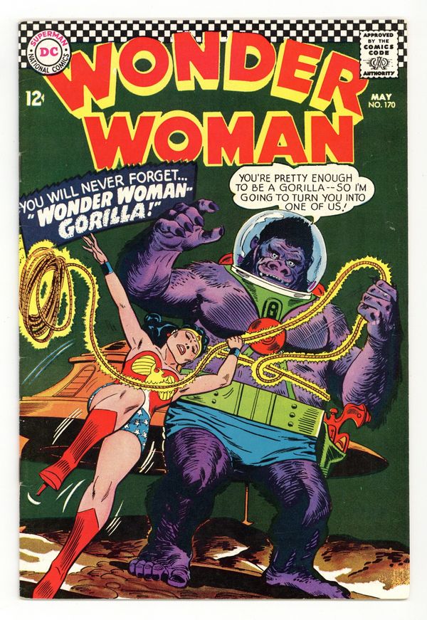 Cover pencils by Ross Andru, inks by Mike Esposito. "The Haunted Amazon," script by Robert Kanigher, pencils by Ross Andru, inks by Mike Esposito; After Dr. Psycho performs plastic surgery to make a gangleader look like Steve Trevor, Wonder Woman is psychologically inhibited from fighting him, and retires. "Wonder Woman - Gorilla!", script by Robert Kanigher, pencils by Ross Andru, inks by Mike Esposito; A band of gorillas from outer space land on Earth and attempt to take Wonder Woman and other Amazons for wives. 36 pages, Full Color. Cover price $0.12.
