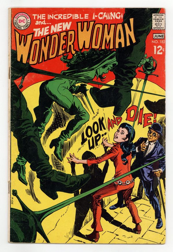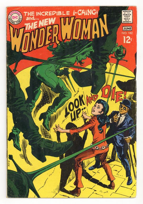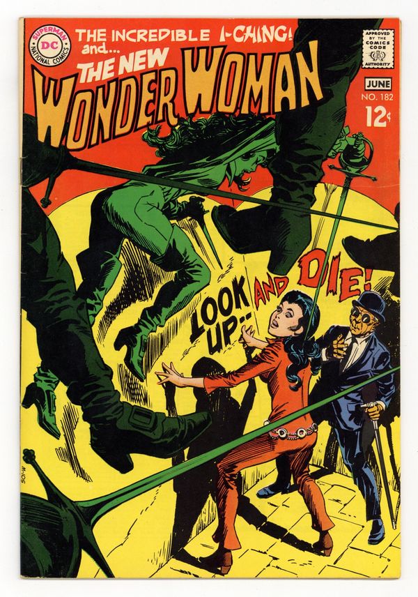 Last 12-cent cover price. Cover pencils by Mike Sekowsky, inks by Dick Giordano. "A Time to Love a Time to Die!", script and pencils by Mike Sekowsky, inks by Dick Giordano; Trench takes the treasure Cyber offered and runs, leaving Diana and Ching to fight off Cyber's falcons, as the villainess escapes; They are joined by Reginald Hyde-Whyte who tends to their wounds and takes them to London where Diana loses herself in Carnaby Street and thoughts of romance, while Ching avoids another attempt on his life; After they reunite, the trio follows Cyber's trail to a gathering of the elite of London society where she plans to steal their jewels. 36 pages, Full Color. Cover price $0.15.