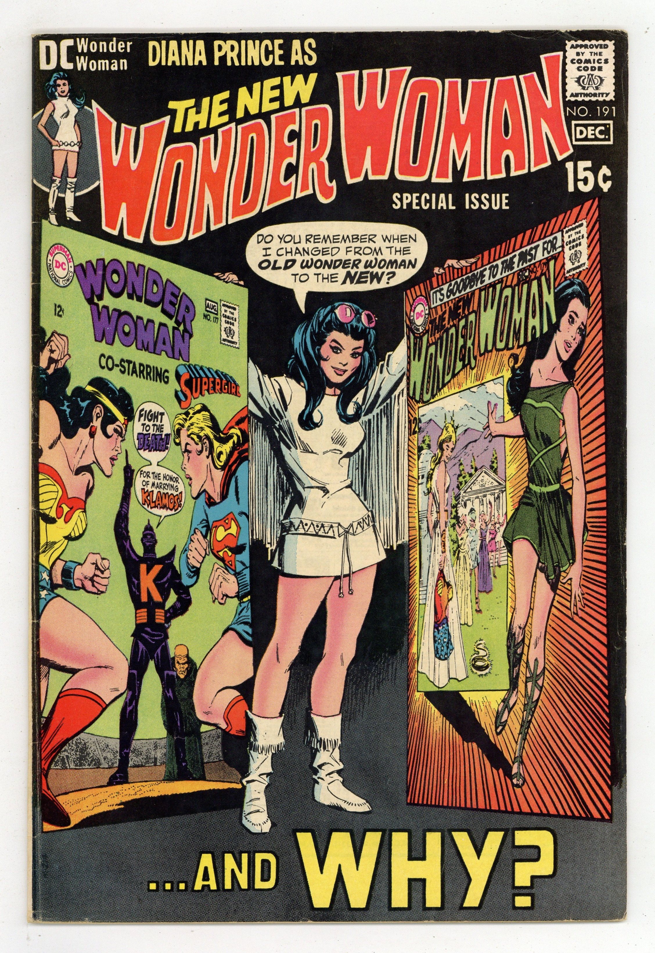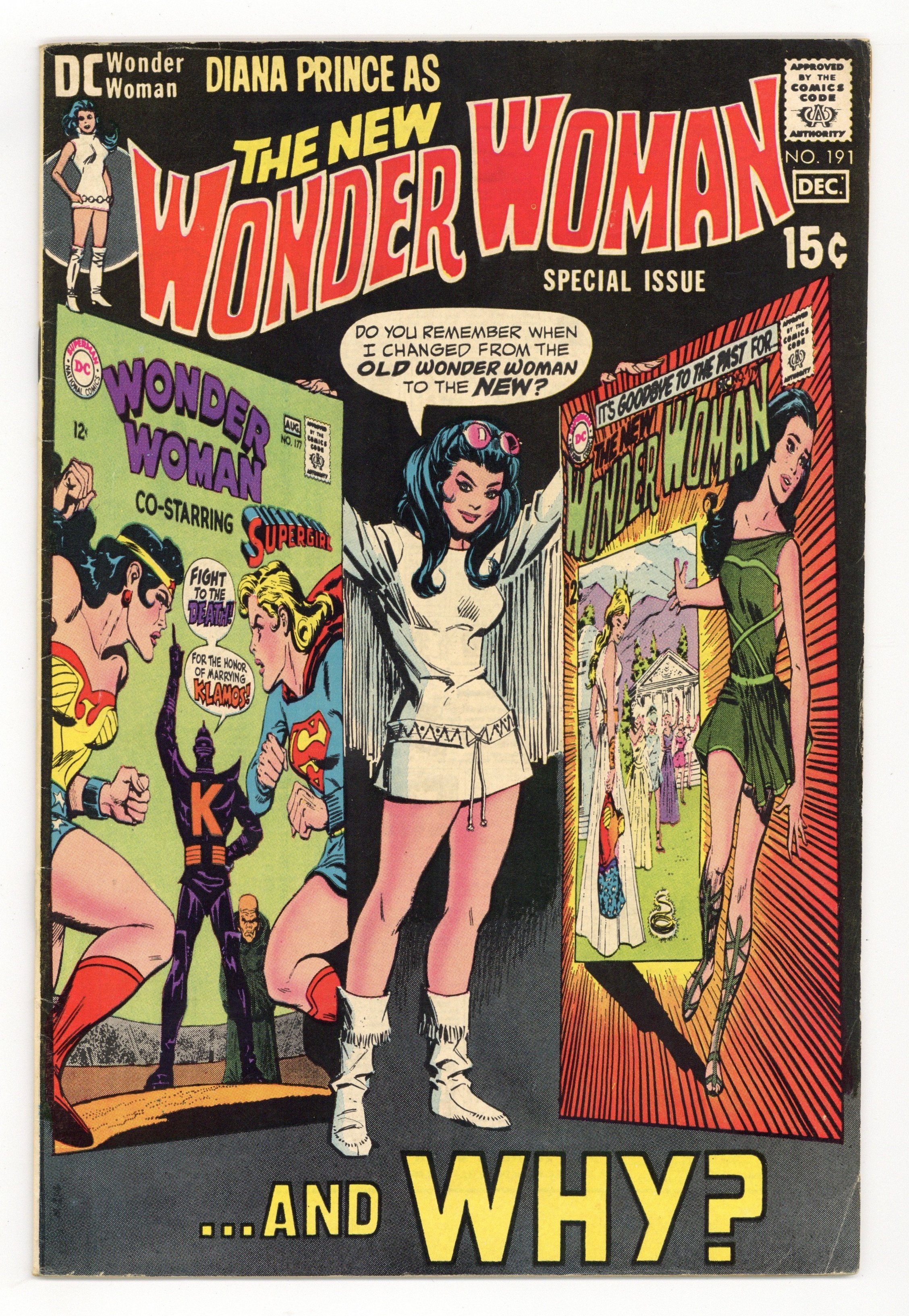 "Detour 2." Continued from last issue; continued next issue. (Note: This story is six pages of new material wrapped around an edited reprint of issue #179.) Written and pencilled by Mike Sekowsky, with inks by Dick Giordano. Characters: Wonder Woman; I-Ching; Ranagor the Barbarian; Steve Trevor. Cover by Mike Sekowsky and Dick Giordano. 36 pages, Full Color. Cover price $0.15.