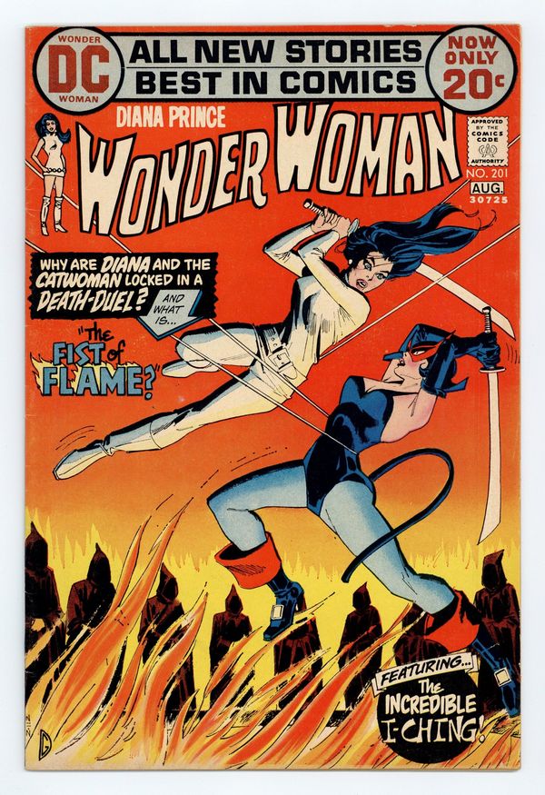 20-cent cover price begins. Cover by Dick Giordano. "The Fist of Flame," script by Denny O'Neil, art by Dick Giordano; Diana and I-Ching visit Jonny Doubles office to find him gone, a smear of blood on the floor, and two Asian assassins inside; Diana fights cultists; Catwoman, wanting a gem, attacks Wonder Woman; Diana, Catwoman, and I-Ching phase out of their world, and re-materialize on the world of Nehwon, where they look up to see Fafhrd and the Grey Mouser, making their first appearance (cameo), before them. 36 pages, Full Color. Cover price $0.20.
