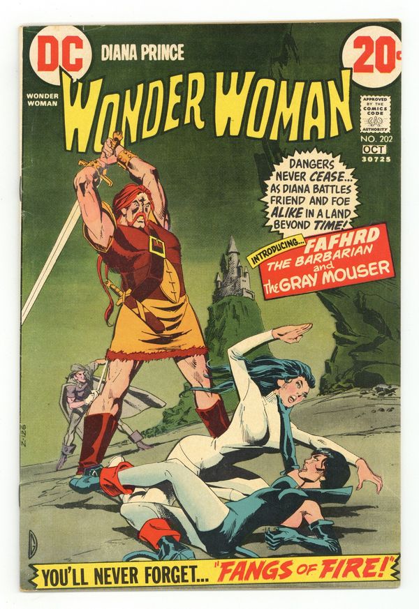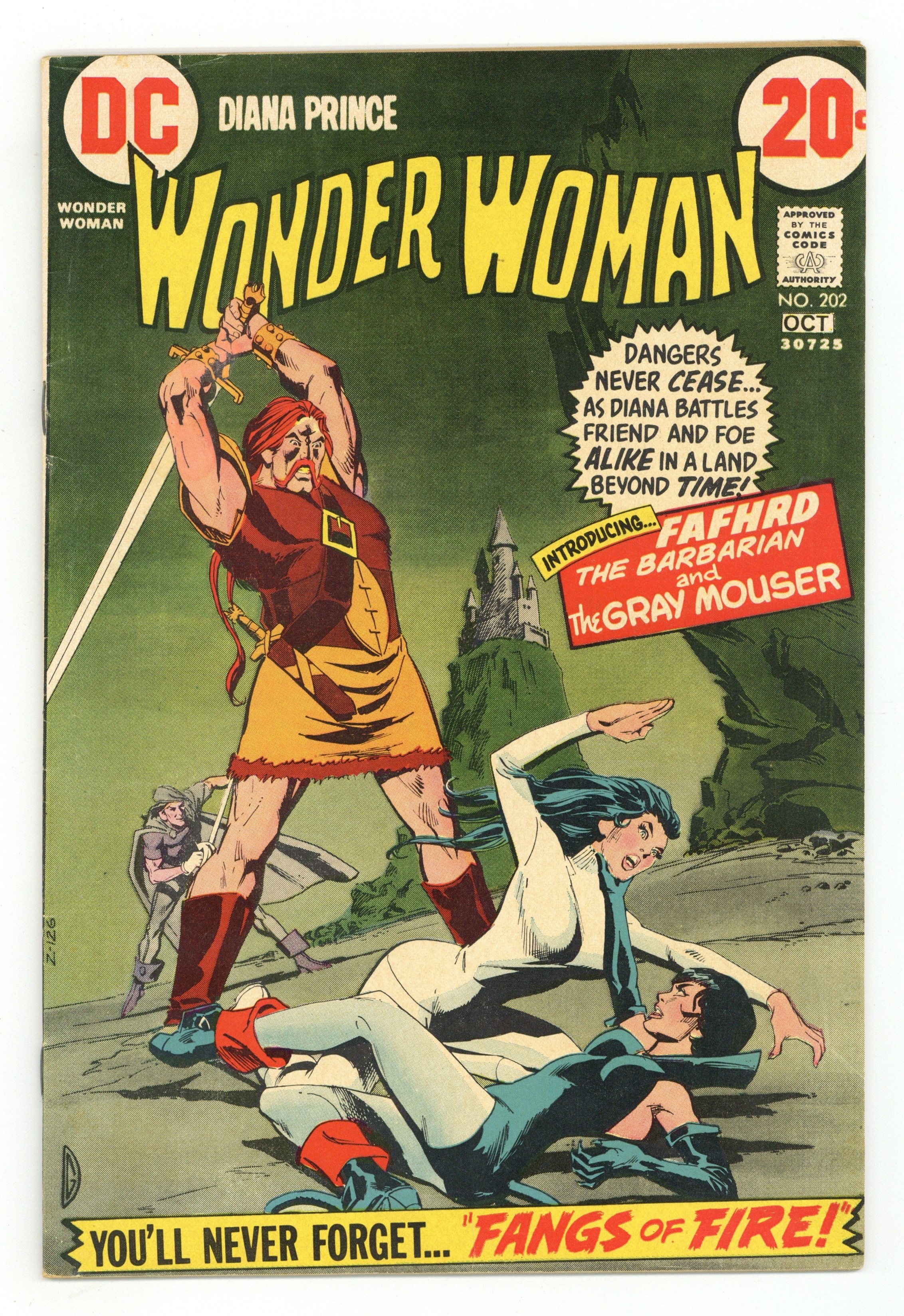Cover by Dick Giordano. First full comic book appearance of Fafhrd and Grey Mouser in "Fangs of Fire," script by Samuel R. Delany, art by Dick Giordano; After a fight breaks out among Fafhrd and the Grey Mouser and Diana and Catwoman, I-Ching halts it by producing the Fist of Flame; He informs them that the Flame Fist has a sister jewel, the Eye of the Ocean (which Fafhrd and the Mouser had sought), and that one can look into one gem and see what is in front of the other; Diana looks into the gem and sees Jonny Doubles face; Jonny proves to be a prisoner of Lu Shan, I-Chings daughter, who has the Eye of the Ocean and seeks the Fist of Flame; when joined in a dimensional energy transfer matrix machine, the gems energies can pierce dimensions, which will enable Lu Shan to enter and loot Nehwon; Diana and I-Ching get transported to another dimension. 36 pages, Full Color. Cover price $0.20.