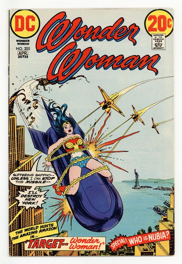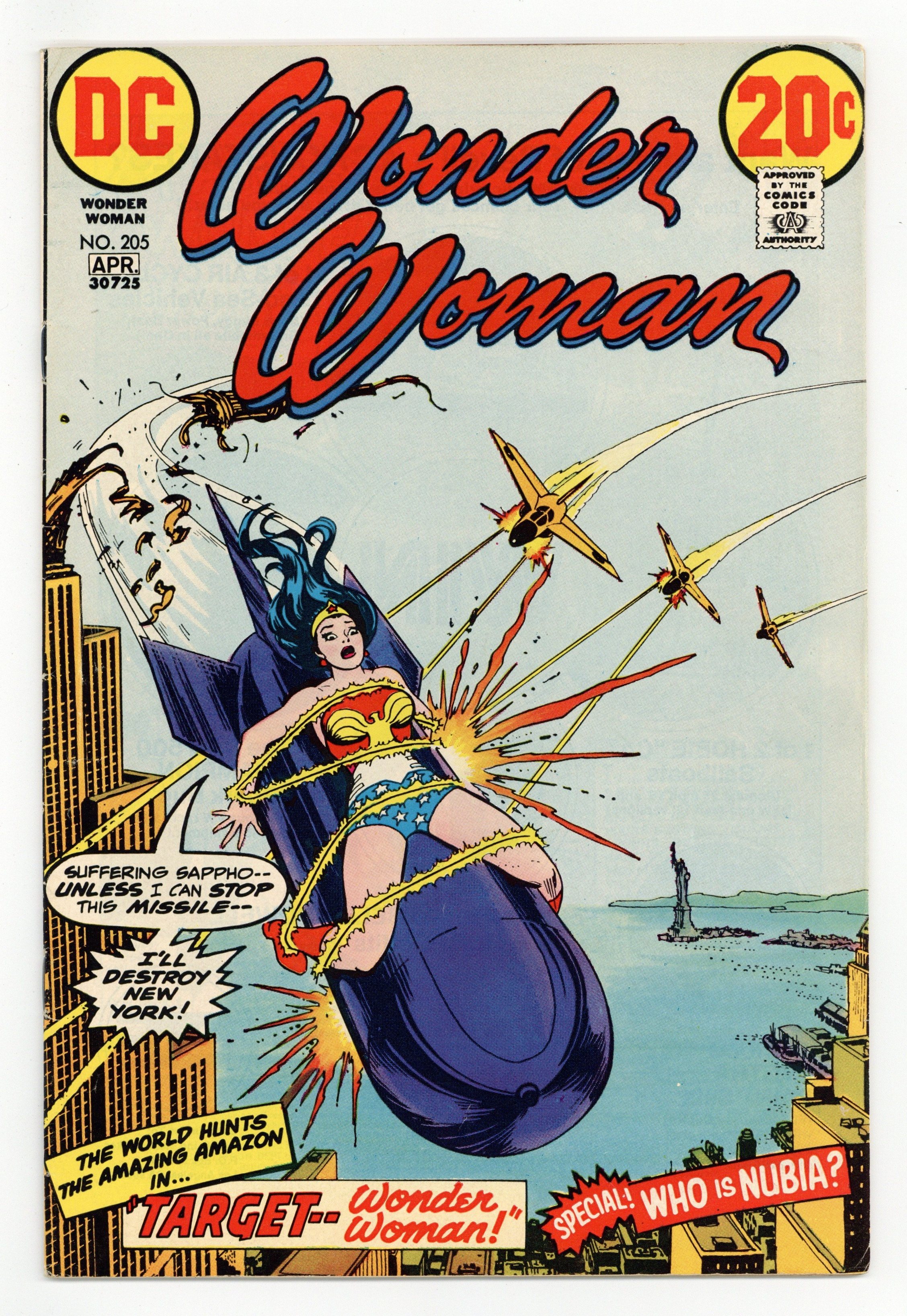 Cover by Nick Cardy. "Target Wonder Woman!", script by Robert Kanigher, pencils by Don Heck, inks by Bob Oksner; A terrorist named Dr. Domino tries to force U.N. troubleshooter Morgan Tracy to spill the knowledge of a deadly weapon by tying Wonder Woman to a missile and launching it. Half-page text describes the magic lasso, the robot plane, Wonder Woman's bracelets, and the tiara. "The Mystery of Nubia," script by Robert Kanigher, pencils by Don Heck, inks by Vinnie Colletta; On the floating island where she reigns, Nubia stops a fight between two rivals for her hand by offering to fight one of them herself. 36 pages, Full Color. Cover price $0.20.