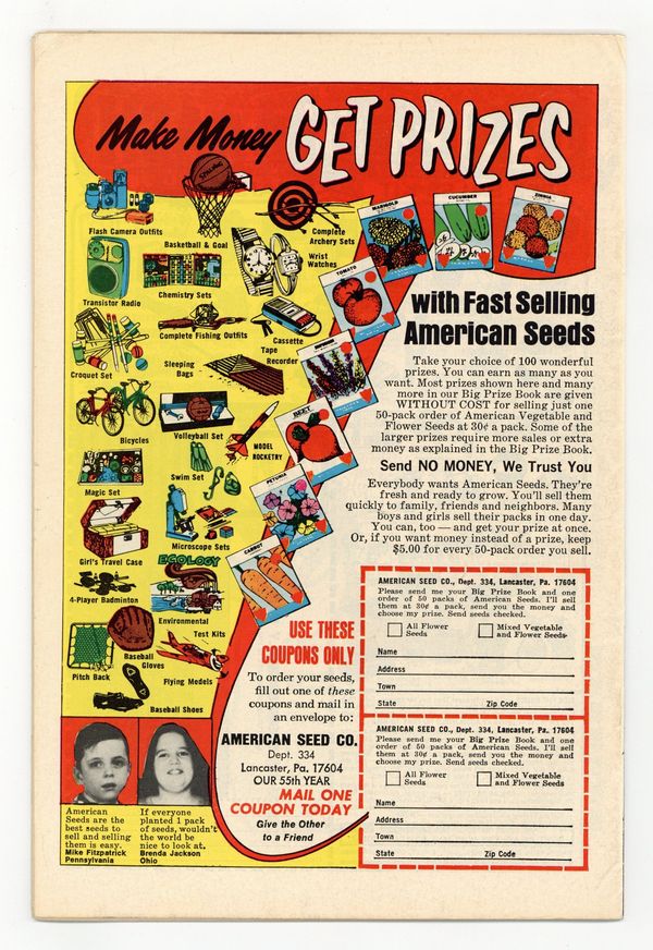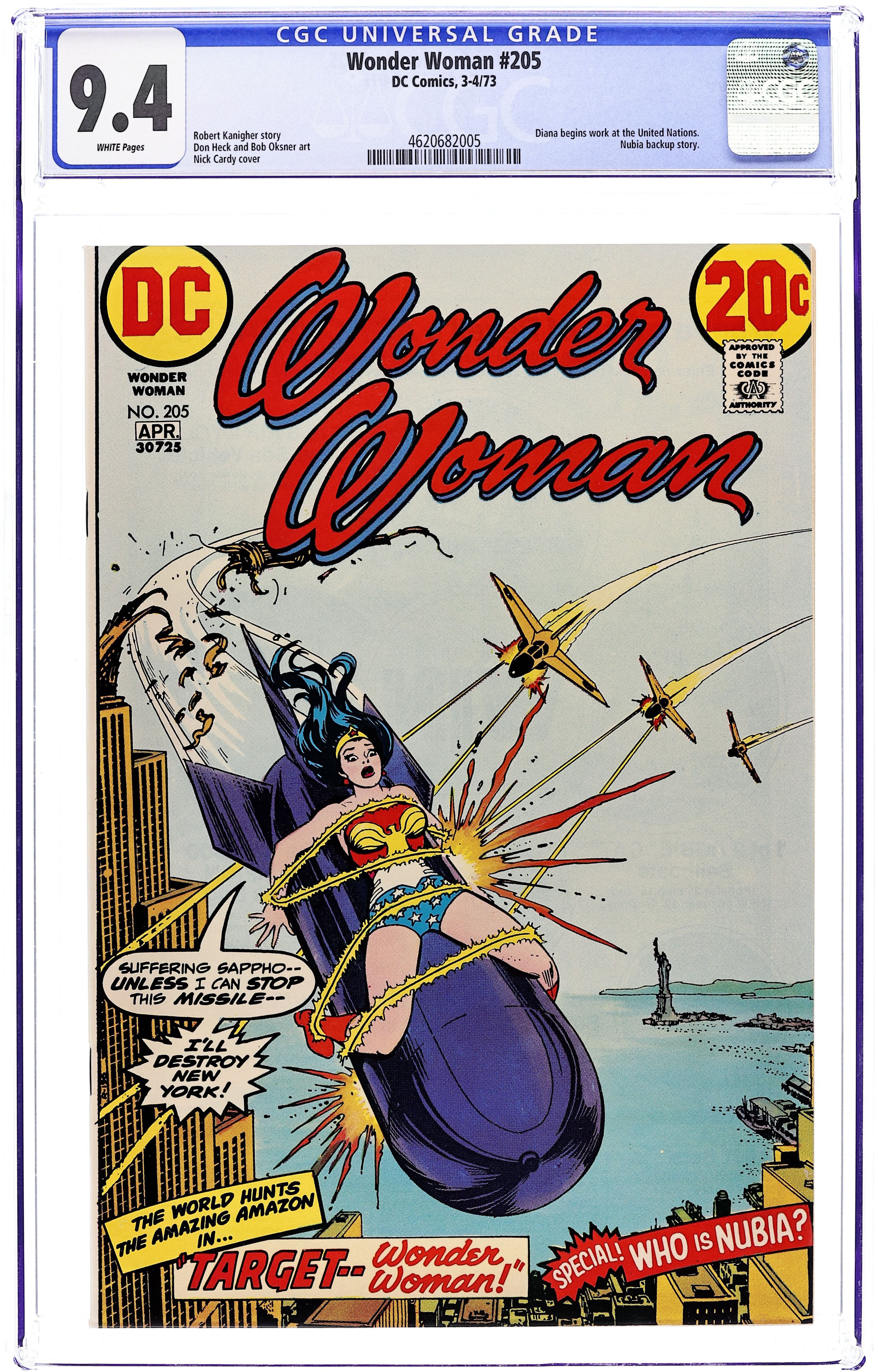 Ends Dec 8 10:10 PM CST Bid History 5 bids Current Bid $99 Your Secret Max Bid If you'd like to bid, please log in or register. Cover by Nick Cardy. "Target Wonder Woman!", script by Robert Kanigher, pencils by Don Heck, inks by Bob Oksner; A terrorist named Dr. Domino tries to force U.N. troubleshooter Morgan Tracy to spill the knowledge of a deadly weapon by tying Wonder Woman to a missile and launching it. Half-page text describes the magic lasso, the robot plane, Wonder Woman's bracelets, and the tiara. "The Mystery of Nubia," script by Robert Kanigher, pencils by Don Heck, inks by Vinnie Colletta; On the floating island where she reigns, Nubia stops a fight between two rivals for her hand by offering to fight one of them herself. 36 pages, Full Color. Cover price $0.20.