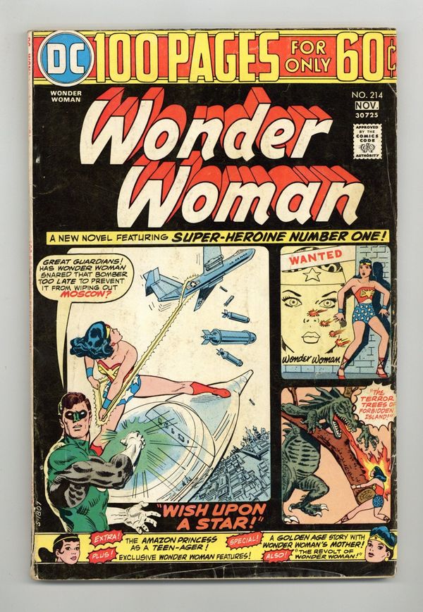 Cover by Bob Oksner. Green Lantern guest stars in a new story, "Wish Upon a Star!", script by Elliot S! Maggin, pencils by Curt Swan, inks by Frank Giacoia (as Phil Zupa); Green Lantern observes Wonder Woman's third mission, when a gentleman's magic wish almost sends the world into World War III. Reprints: "Wanted - Wonder Woman" (from Wonder Woman 108), script by Robert Kanigher, pencils by Ross Andru, inks by Mike Esposito; Space invaders try to hypnotize Wonder Woman into marrying Steve Trevor. "The Terror Trees of Forbidden Island" (from Wonder Woman 143), script by Robert Kanigher, pencils by Ross Andru, inks by Mike Esposito; Wonder Woman travels to Forbidden Island to try to get a new Sun Sword. "The Invisible Wonder Girl!" (from Wonder Woman 106), script by Robert Kanigher, pencils by Ross Andru, inks by Mike Esposito. "The Masquerader" (formerly untitled story from Sensation 26), script by William Moulton Marston, art by Harry G. Peter; Hippolyte masquerades as Wonder Woman. "Revolt of Wonder Woman!" (from Wonder Woman 144), script by Robert Kanigher, pencils by Ross Andru, inks by Mike Esposito; Wonder Woman makes a blind friend, who doesn't treat Diana as special, which makes her happy. 100 pages, Full Color. Cover price $0.60.